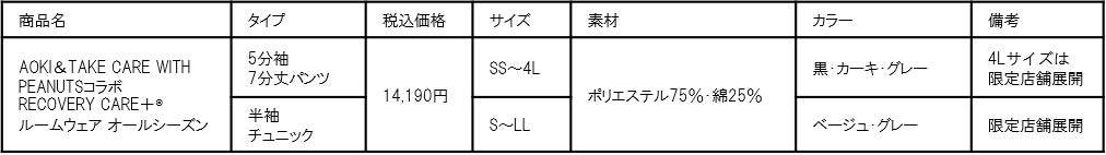 AOKI&TAKE CARE WITH PEANUTSのコラボレーションから疲労回復ウェア「RECOVERY CARE+®」春夏の新作5分袖7分丈パンツ・5分袖チュニックタイプの販売を開始