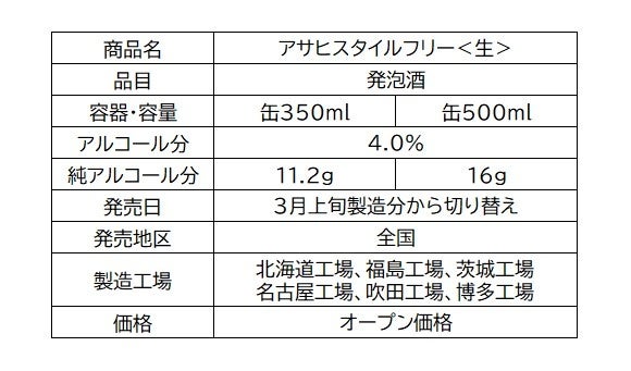 アサヒビール株式会社(本社 東京、社長 松山一雄)は、『アサヒスタイルフリー<生>』の中味とパッケージデザインを刷新し、3月上旬製造分から順次切り替えます。