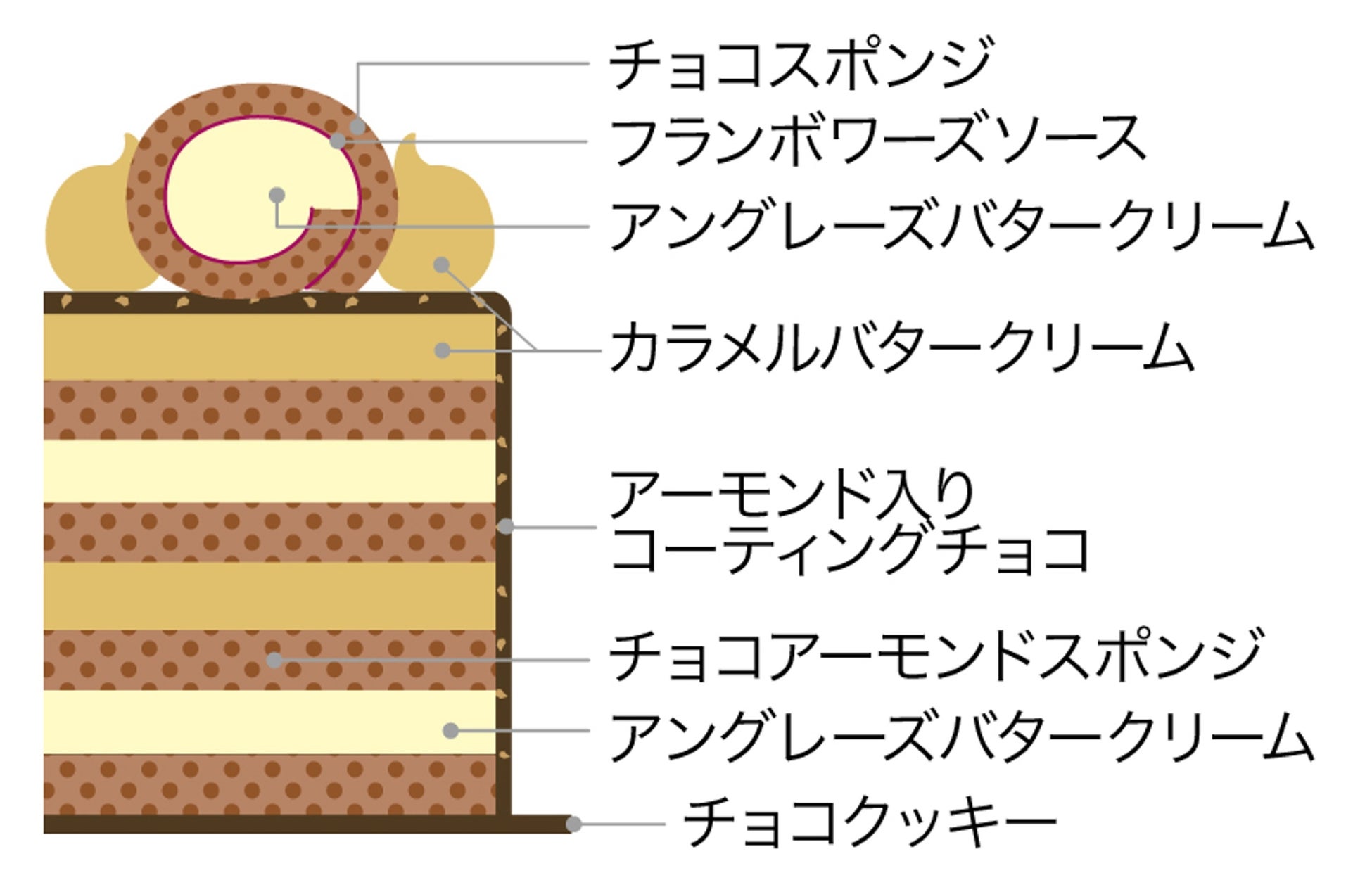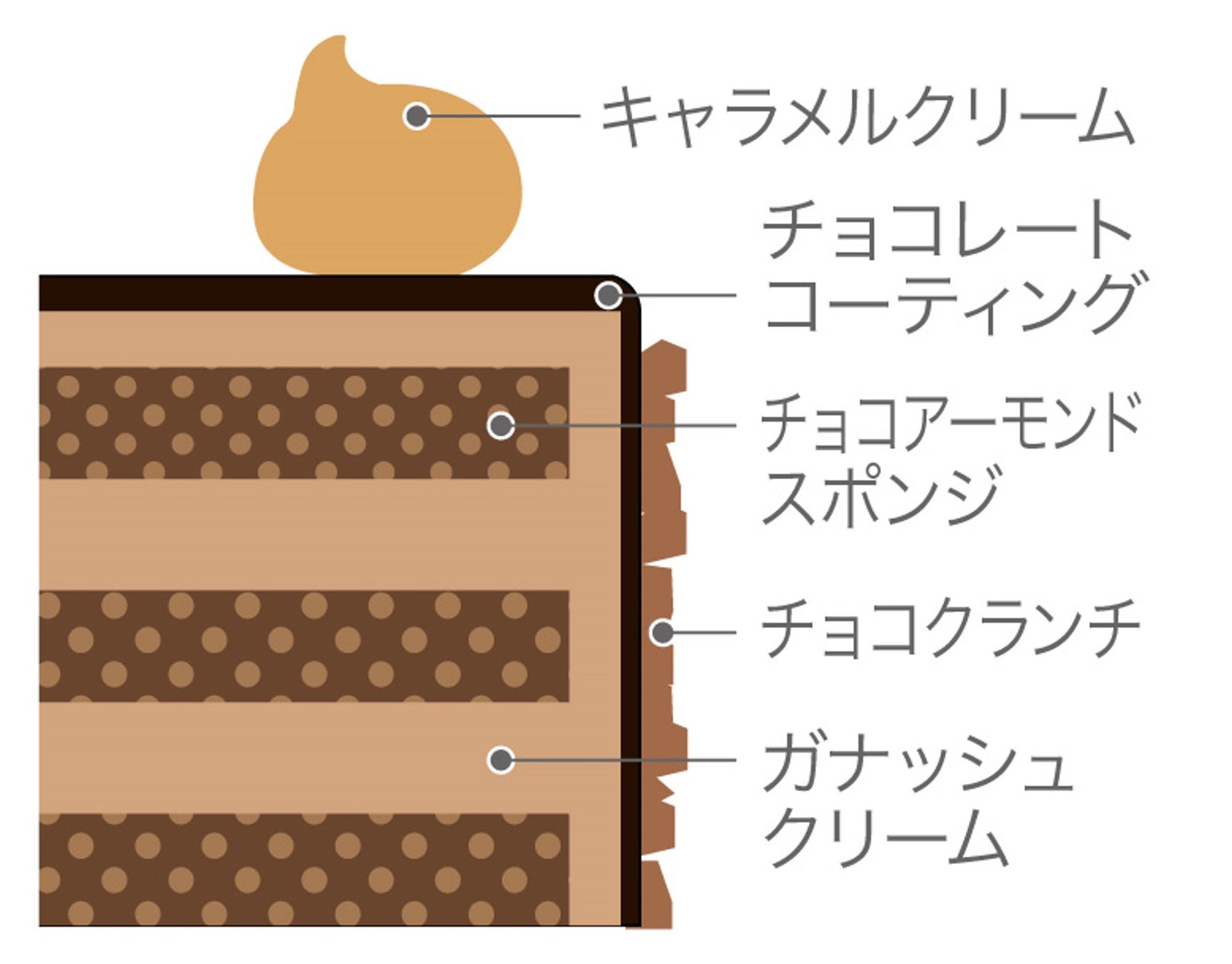 コクのあるガナッシュクリームとチョコアーモンドスポンジをチョコレートで包み、上には丁寧に炊いたキャラメルソース入りのクリームを絞りました。
