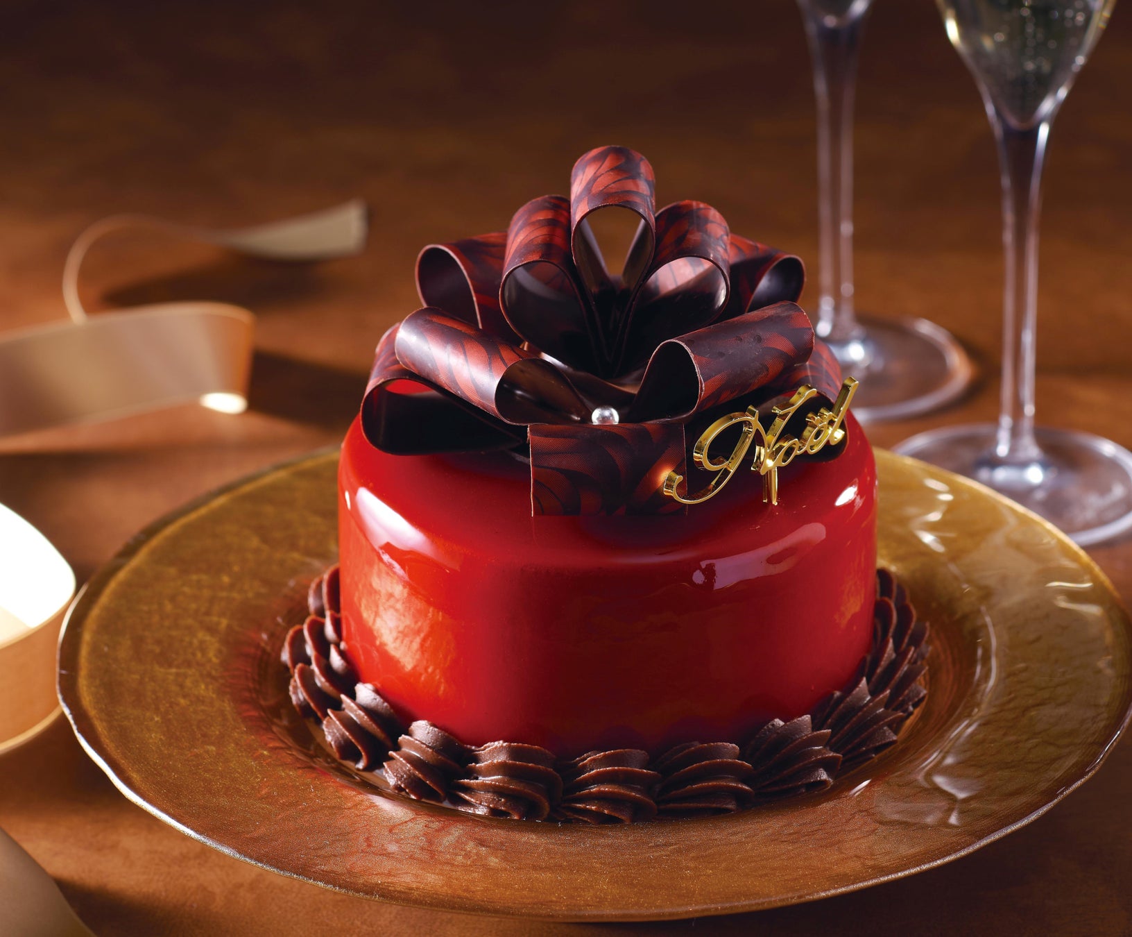 職人がチョコレートで1つ1つ丁寧に形づくったリボンをのせた、艶やかなクリスマスプレゼントボックス。