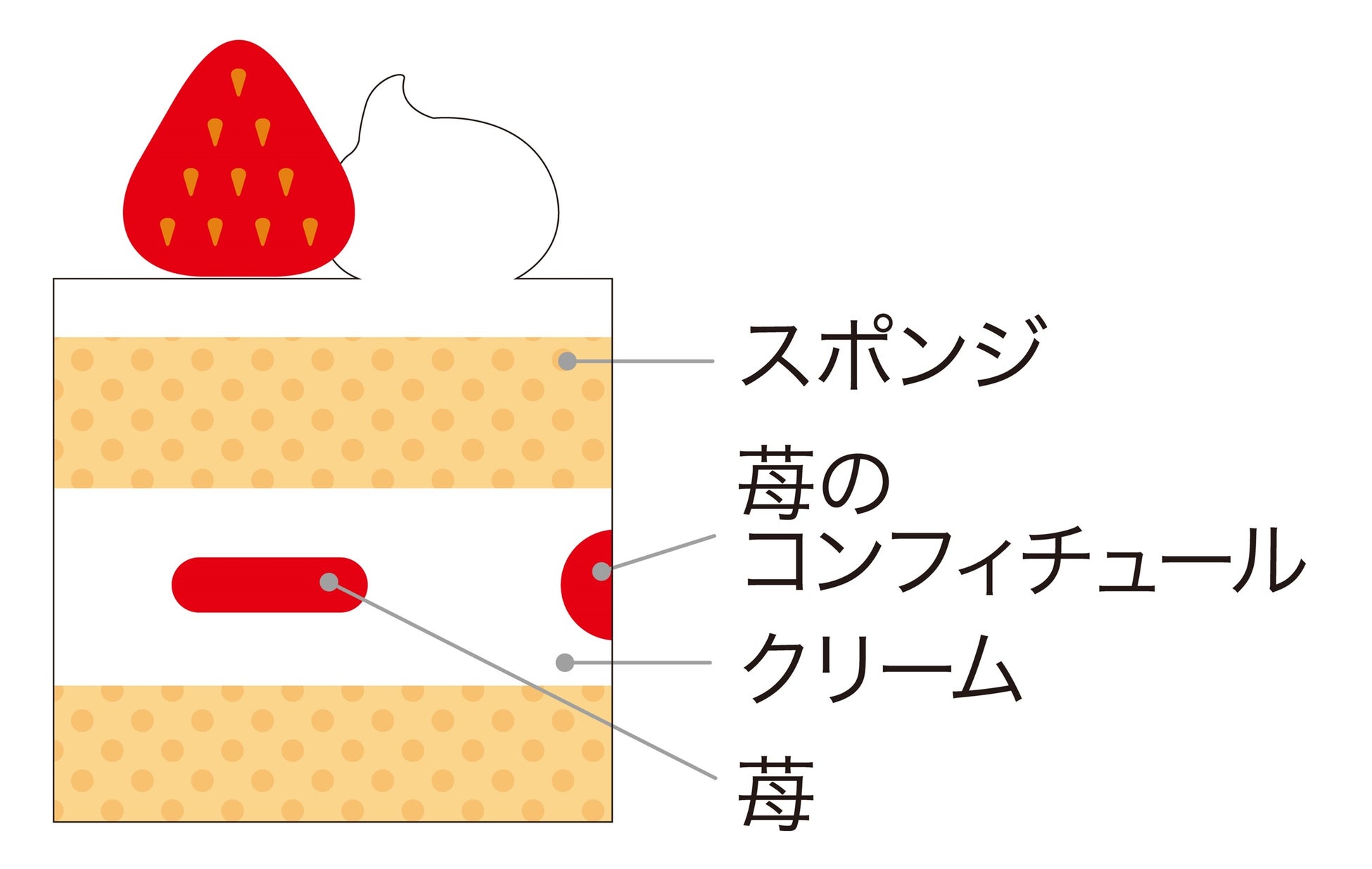 北海道産生クリームをブレンドした口どけの良いクリームときめ細かに焼き上げたスポンジケーキで苺をサンド。