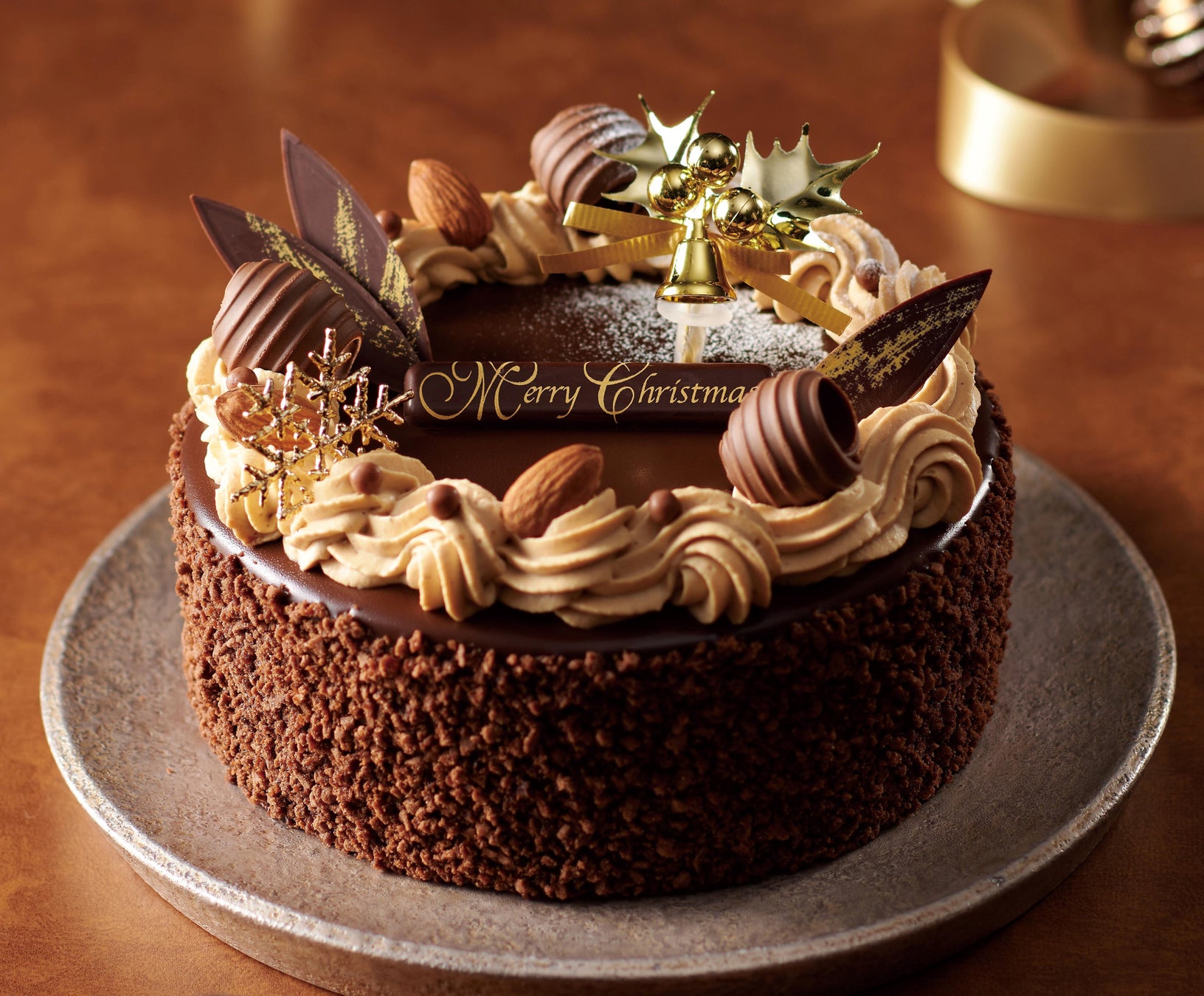 チョコアーモンドスポンジとコクのあるバタークリームを8層に重ねた、カラメルが香るチョコレートケーキに、小さなブッシュドノエルや、クッキーの屋根をのせました。
