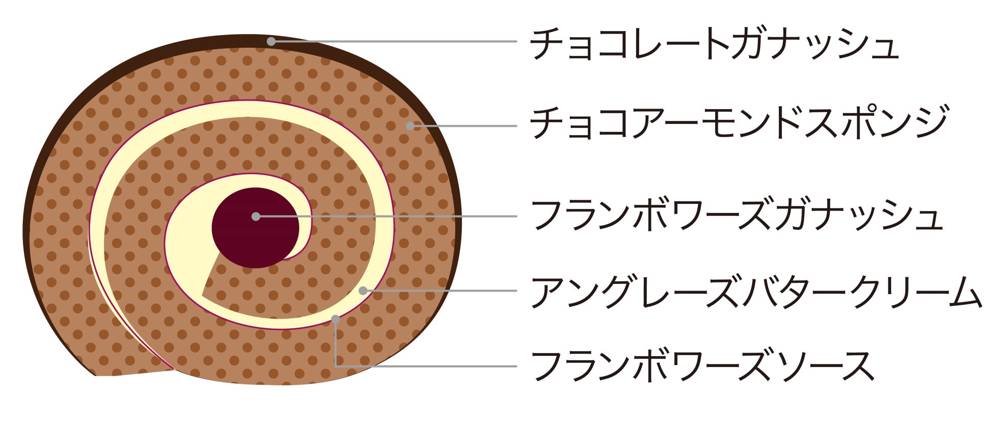バタークリーム、フランボワーズガナッシュをチョコアーモンドスポンジで巻き込んだ深い味わい。中にしのばせたフランボワーズソースが甘酸っぱいアクセントです。