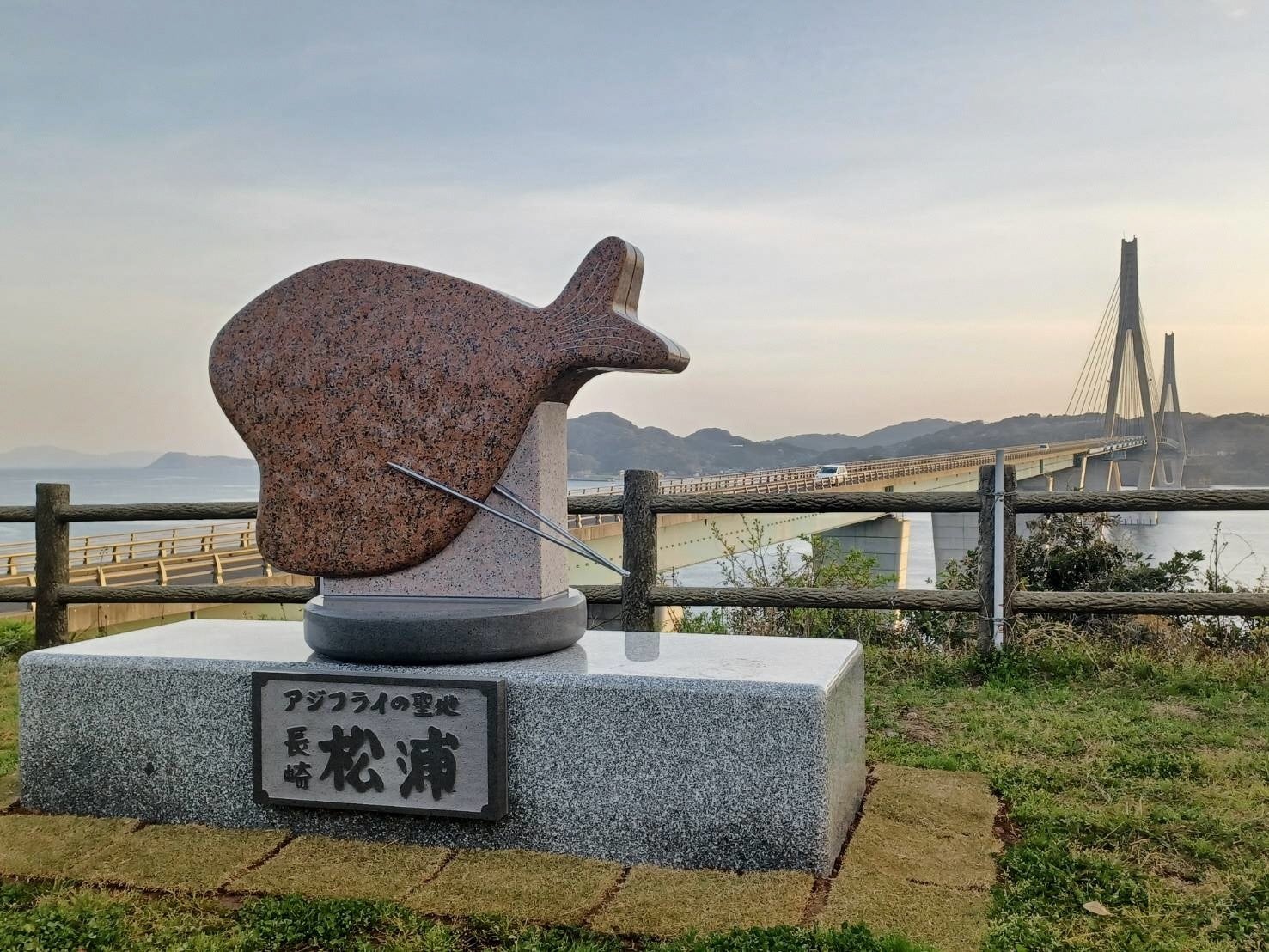 松浦魚市場が誇る日本一のアジの水揚げ量を背景に、「アジフライの聖地」を宣言している長崎県松浦市。市内のいたるところにアジフライのモニュメント(右の写真)があるほか、アジフライを提供している"聖地連携店"では新鮮なアジを揚げたてでいただけます。さらに、市と地元の製菓店が協力してアジフライモチーフのお菓子を作る「アジフライおさんじ」の試みもおこなわれているなど、名実そろった聖地なんです。