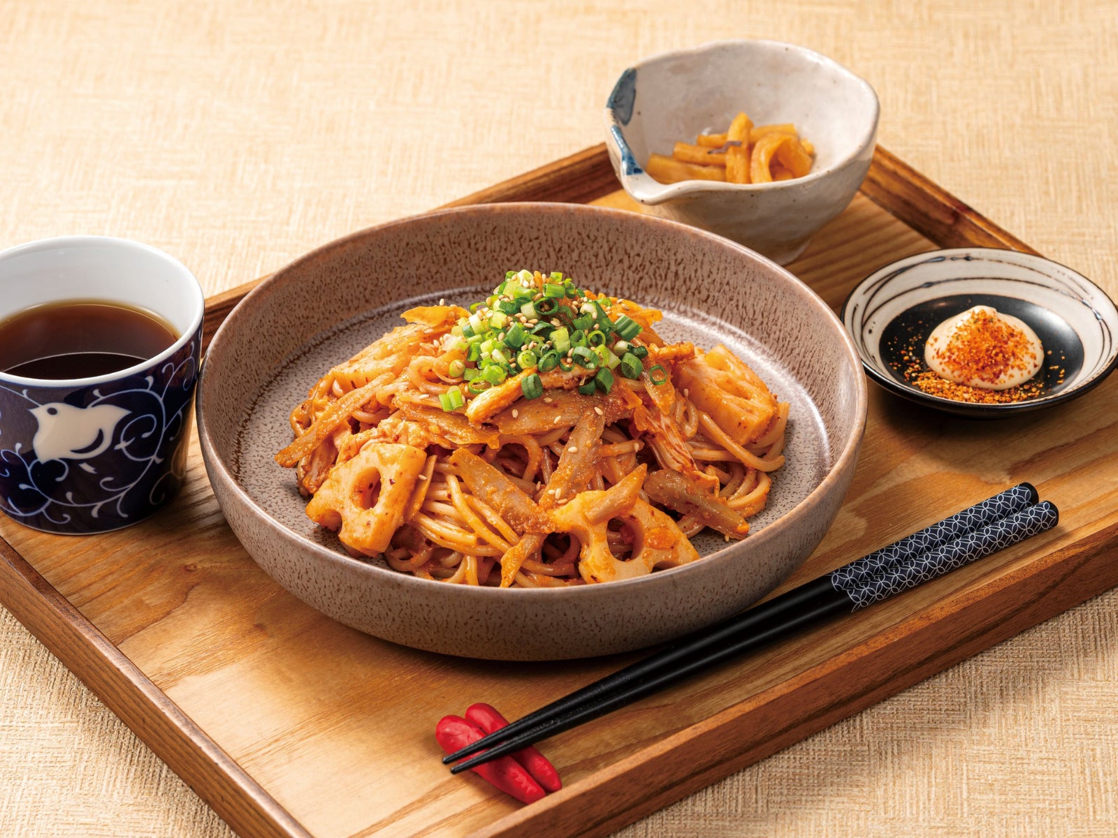 『根菜とたらこのきんぴらペペロンチーノ』は、シャキシャキとした食感のれんこん・ごぼうと鶏肉を香ばしいきんぴら風に、ピリ辛のペペロンチーノとして仕上げた、進化系和風スパゲティです。お好みで別添えの七味マヨを加えれば、コクと辛味がプラスされ、二度おいしい味の変化もお楽しみいただけます。