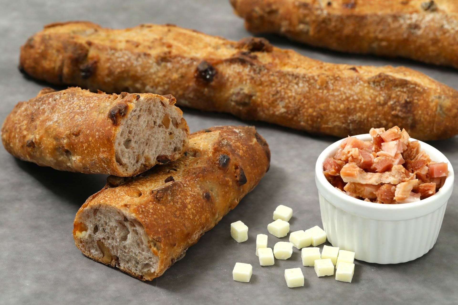 こだわり:チョコの甘みとベーコンの塩味が癖になる新作ライ麦パン。ライ麦生地にクルミとホワイト