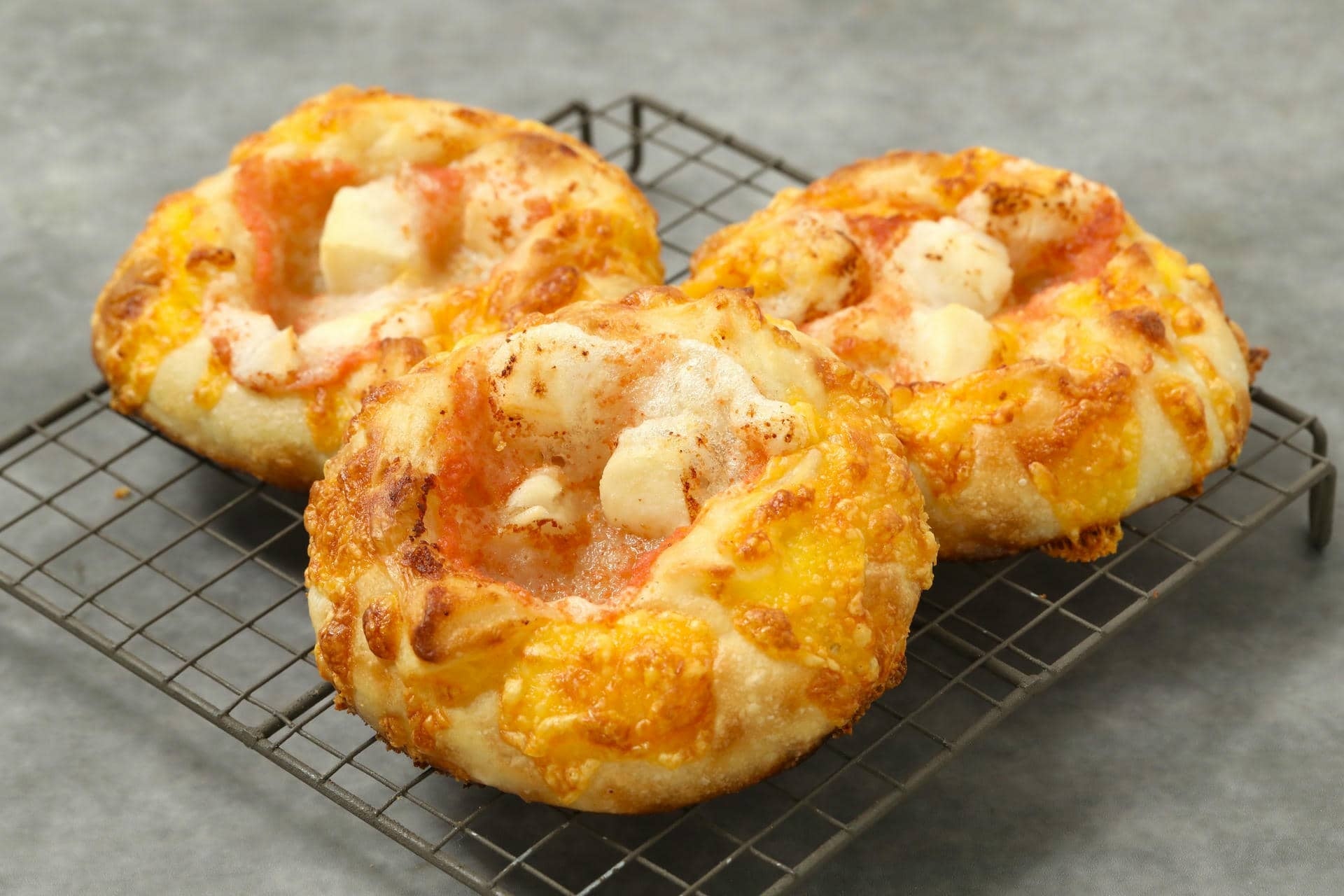 がりと焼き上げました。明太子フィリングのピリッとした辛みと、チェダーチーズのコクが