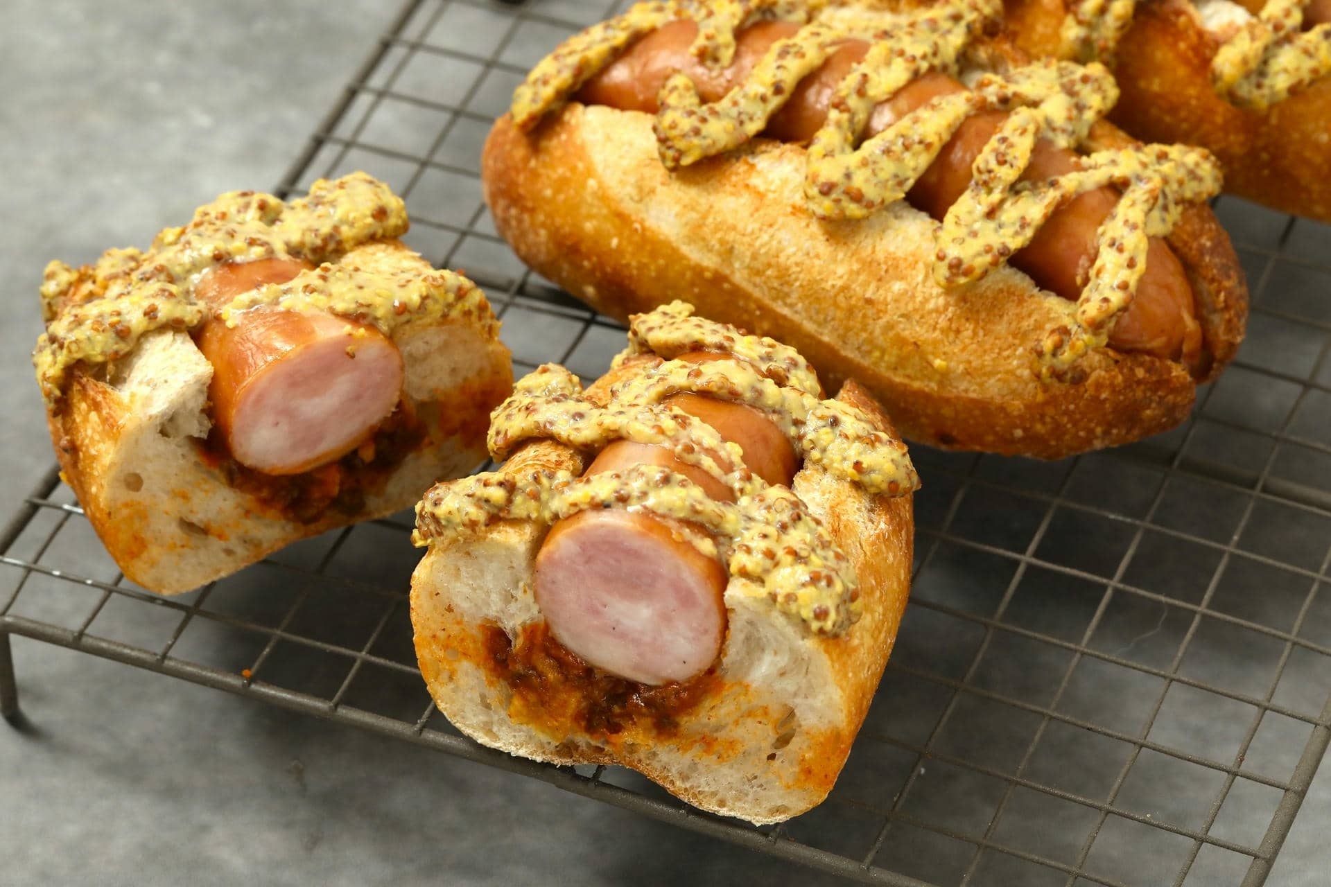 こだわり:ライ麦生地のバゲットにこんがり焼いた大ぶりのフランクフルトとミートソース、フライド