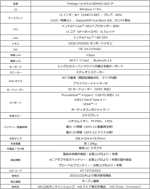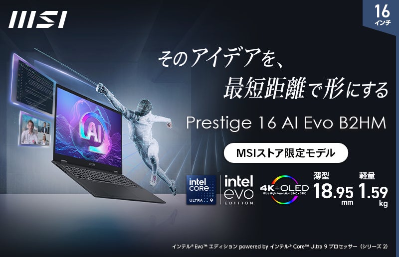 この度、エムエスアイコンピュータージャパン株式会社は、AI専用プロセッサー「NPU」を内蔵した高性能CPU「インテル® Core™ Ultra 9 プロセッサー(シリーズ 2)」を搭載し、高速処理性能によりビジネスを加速させ、AI機能で業務を効率化するビジネスAI ノートPC「Prestige-16-AI-Evo-B2HMG-0651JP」をMSI公式オンラインショップ(以下、MSIストア)にて2025年5月22日(木)より順次発売いたします。
