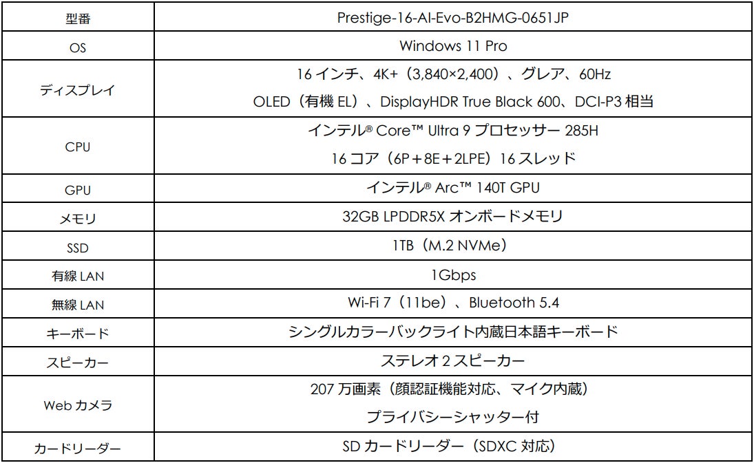 「Prestige-16-AI-Evo-B2HMG-0651JP」シリーズは、最新の「インテル® Core™ Ultra 9 プロセッサー(シリーズ 2)」を搭載した高性能ビジネスノートPCです。