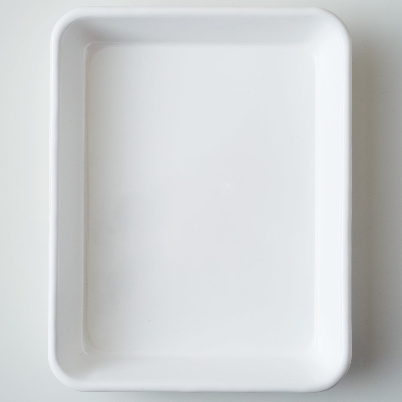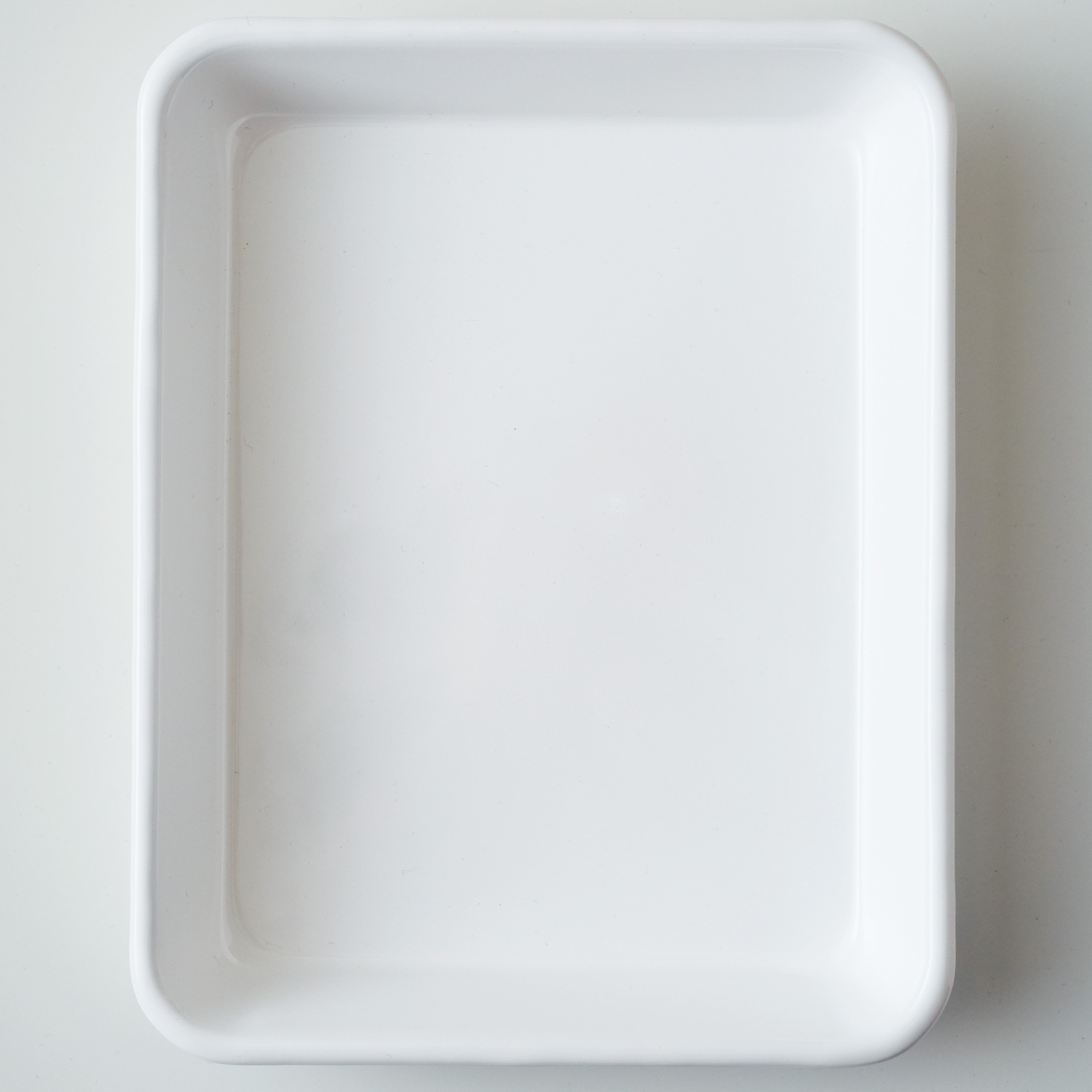 使うのは…料理の下ごしらえに便利なホーローバット。この薄さが、実はお菓子作りにぴったり! 中でも野田琺瑯のキャビネサイズ(20.5〜21cm×16~16.5cm×深さ3cm)が、家族2〜4人にぴったりの食べきりサイズで使い勝手抜群です。