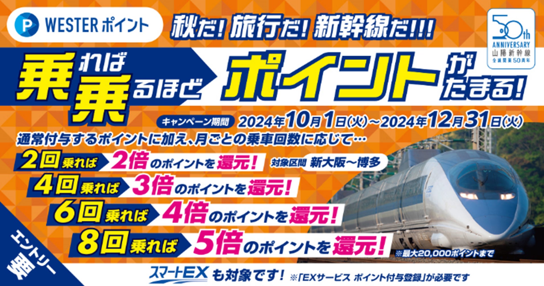 「山陽新幹線全線開業50周年」を記念し、e5489またはEXサービスで山陽新幹線の対象区間をご利用いただいた方へ、2つのWESTERポイントプレゼント企画を実施します!