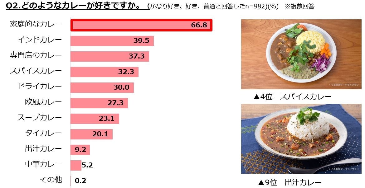 好きな「カレー」については、「家庭的なカレー」が安定の人気だったほか、ここ数年注目されている複雑なスパイスの香りが特徴の「スパイスカレー」やあっさり和風だしのきいた「出汁カレー」などもランクイン。カレーのバリエーションの広がりも高い人気を支えているようです。