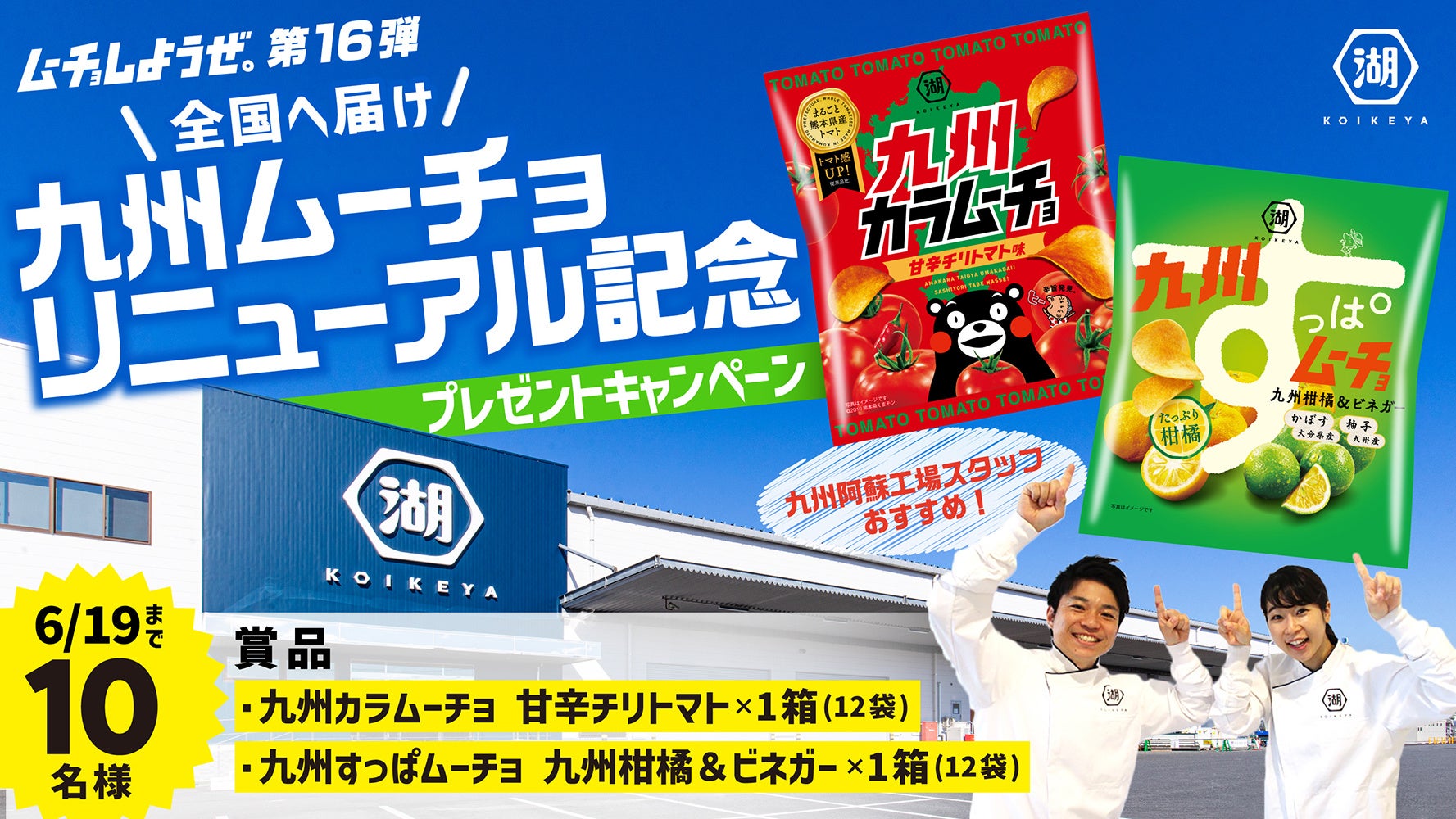湖池屋 九州阿蘇工場のスタッフもおすすめする『九州ムーチョ』が各1箱当たるキャンペーンに、ぜひご応募ください。