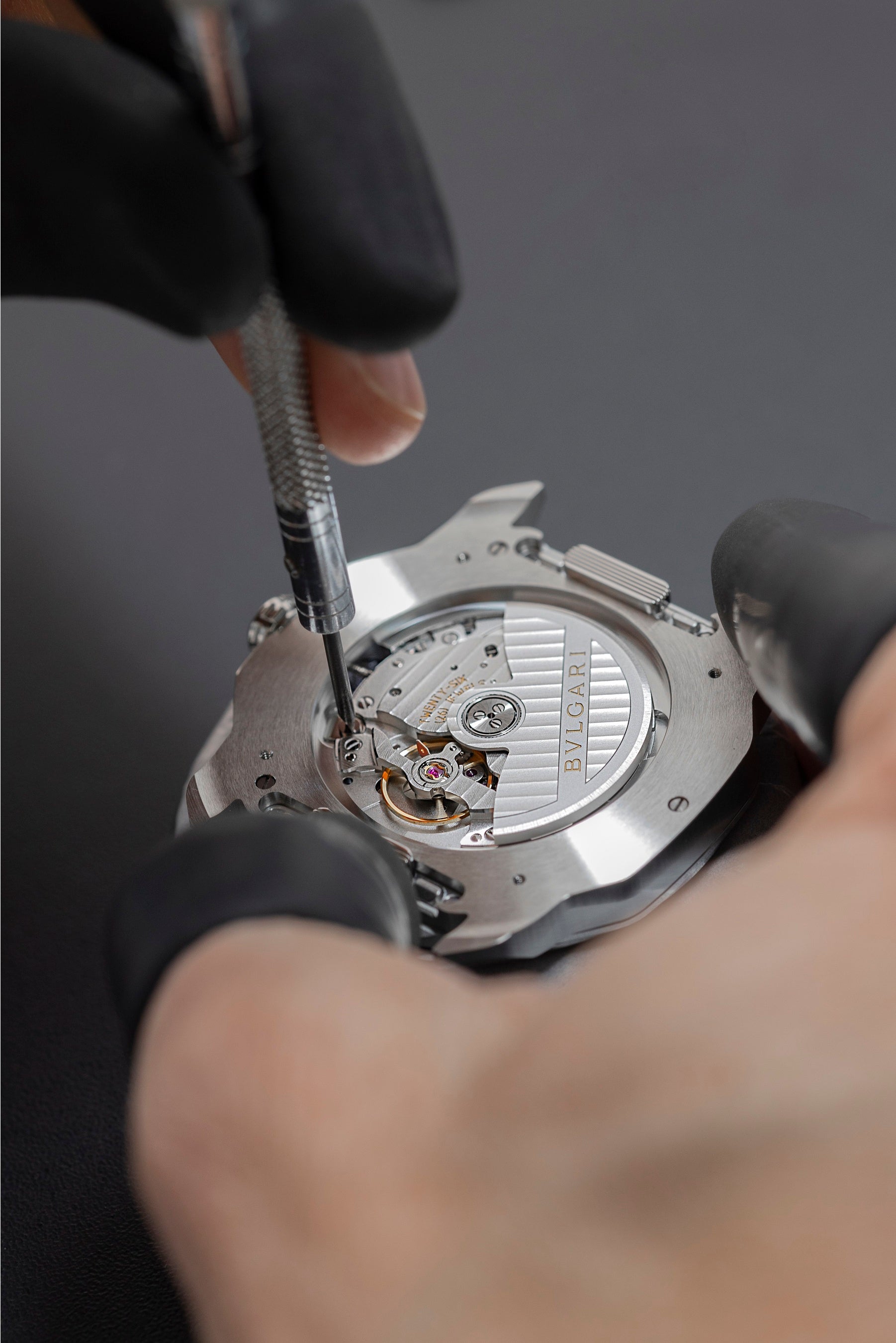 3時、6時、9時のカウンターにはサンバースト加工を施し、クロノグラフをスムーズな操作で読み取ることができるレイアウトを採用しています。信頼性の高さと高精度を誇るスイス製の自動巻き自社製機械式ムーブメントキャリバーBVL399は、手首の動きにより毎時28,800回の振動数で自動的に巻き上がります。ムーブメントの緻密な構造と繊細な装飾はサファイアケースバックから眺めることができます。 ケースと一体化するよう入念に設計された2つのプッシャーをはじめ、フォルム、機能、デザイン、人間工学などそれぞれの要素がローマ建築の不変の教義をベースにアレンジされながら渾然一体の一貫性を成しています。