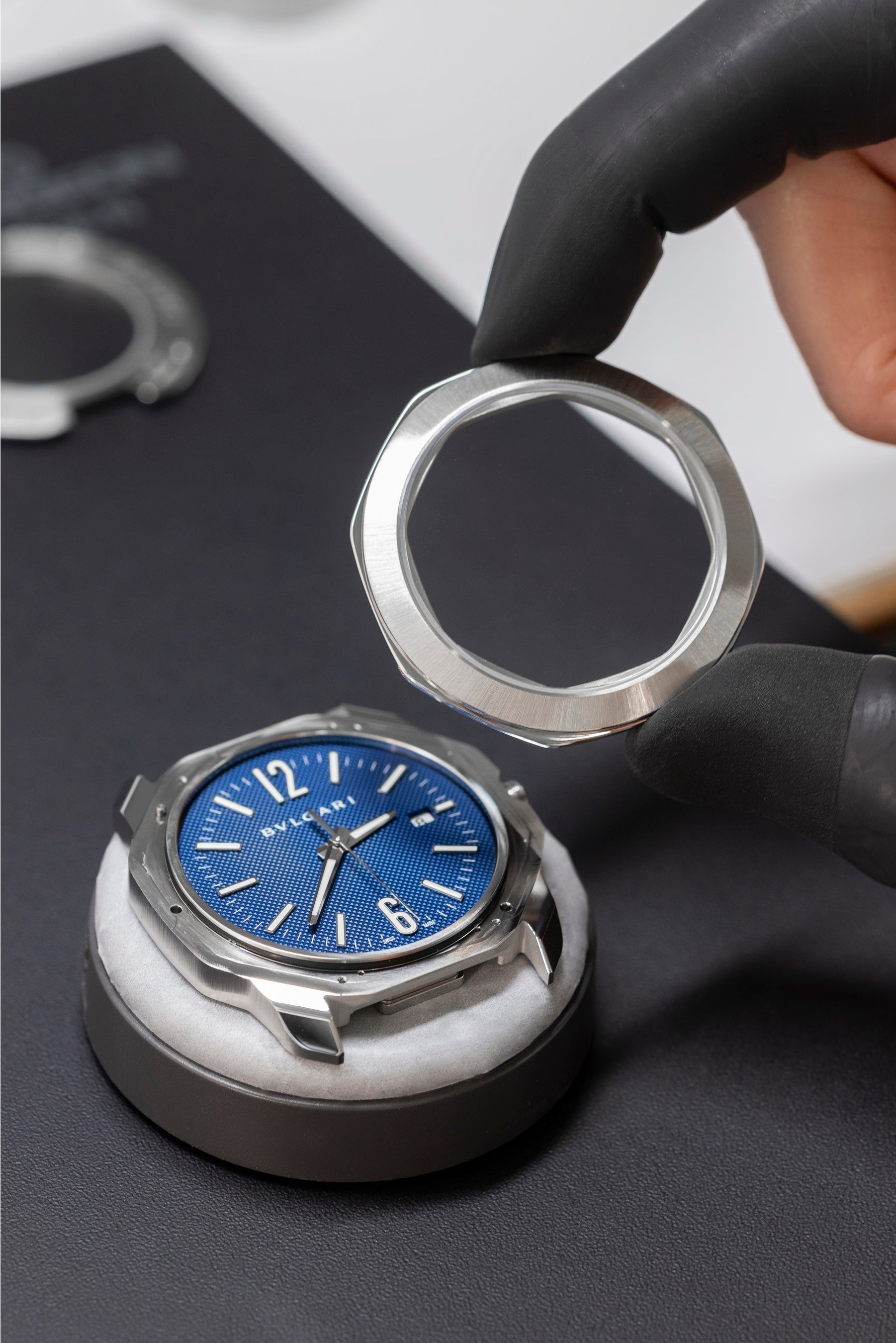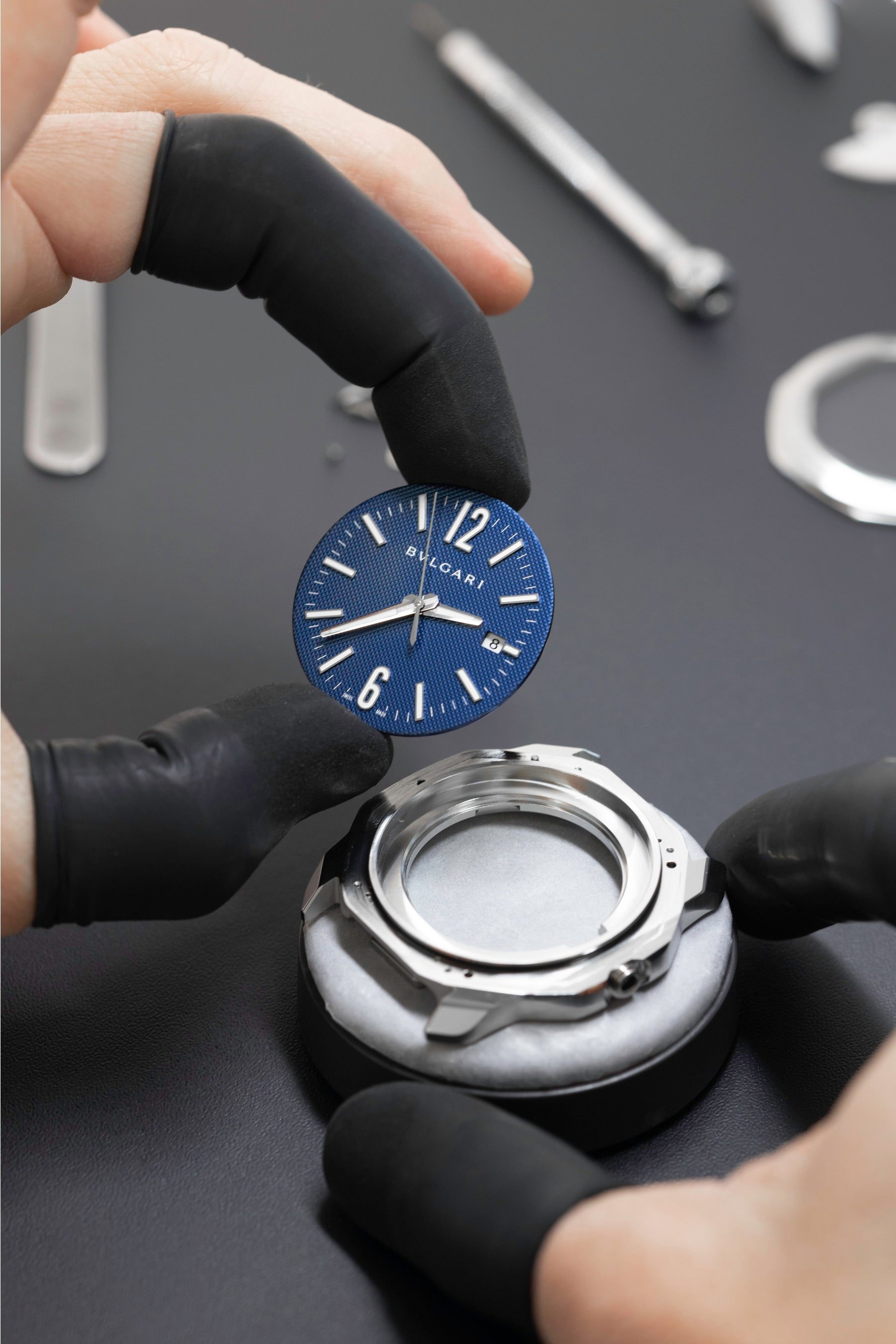 ブルガリのウォッチメイキングにおけるイタリアスタイルは、精巧なクラフツマンシップ、滑らかなライン、計算され尽くしたフォルムのケースなど、「オクト ローマ」の各細部に見られます。「オクト ローマ」は曲線とオクタゴン(8角形)フレームの異なる幾何学的な形を組み合わせた繊細かつ洗練されたケースデザインが目を惹く視覚的なインパクトを実現しています。サテンブラッシュ仕上げの上部ラウンド型ベゼルとサテンおよびポリッシュ仕上げの下部オクタゴン型ベゼルのコントラストが特徴的で、クラシックのようでクラシックではない唯一無二の美学を創り出しています。内側のオクタゴン(8角形)リングがダイヤルのデザイン効果を高め、ファセット加工を施したラグによりバランスの取れた洗練された表情に仕上がっています。緻密にデザインされたディテールを介して「オクト ローマ」はその魅力を放ち、コレクションをブルガリのクラフツマンシップと品質への揺るぎないこだわりを示すステートメントピースへと昇華させています。