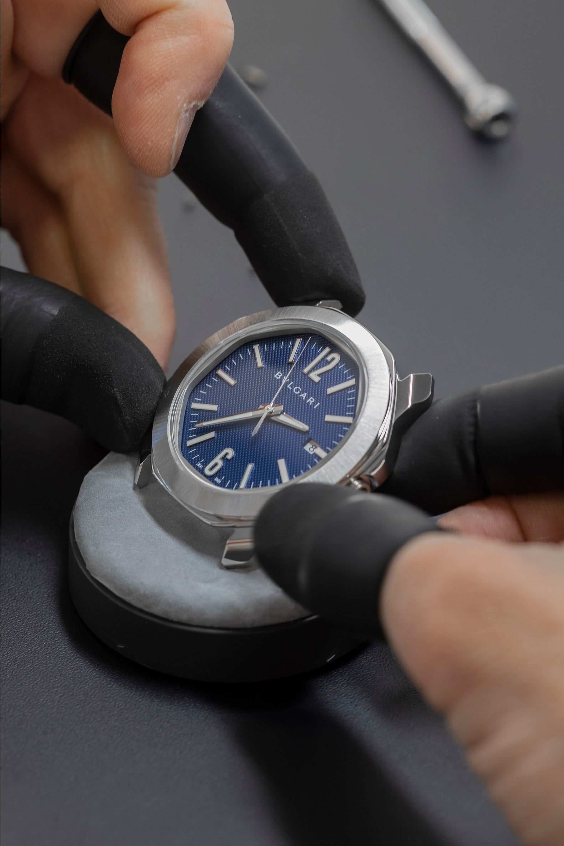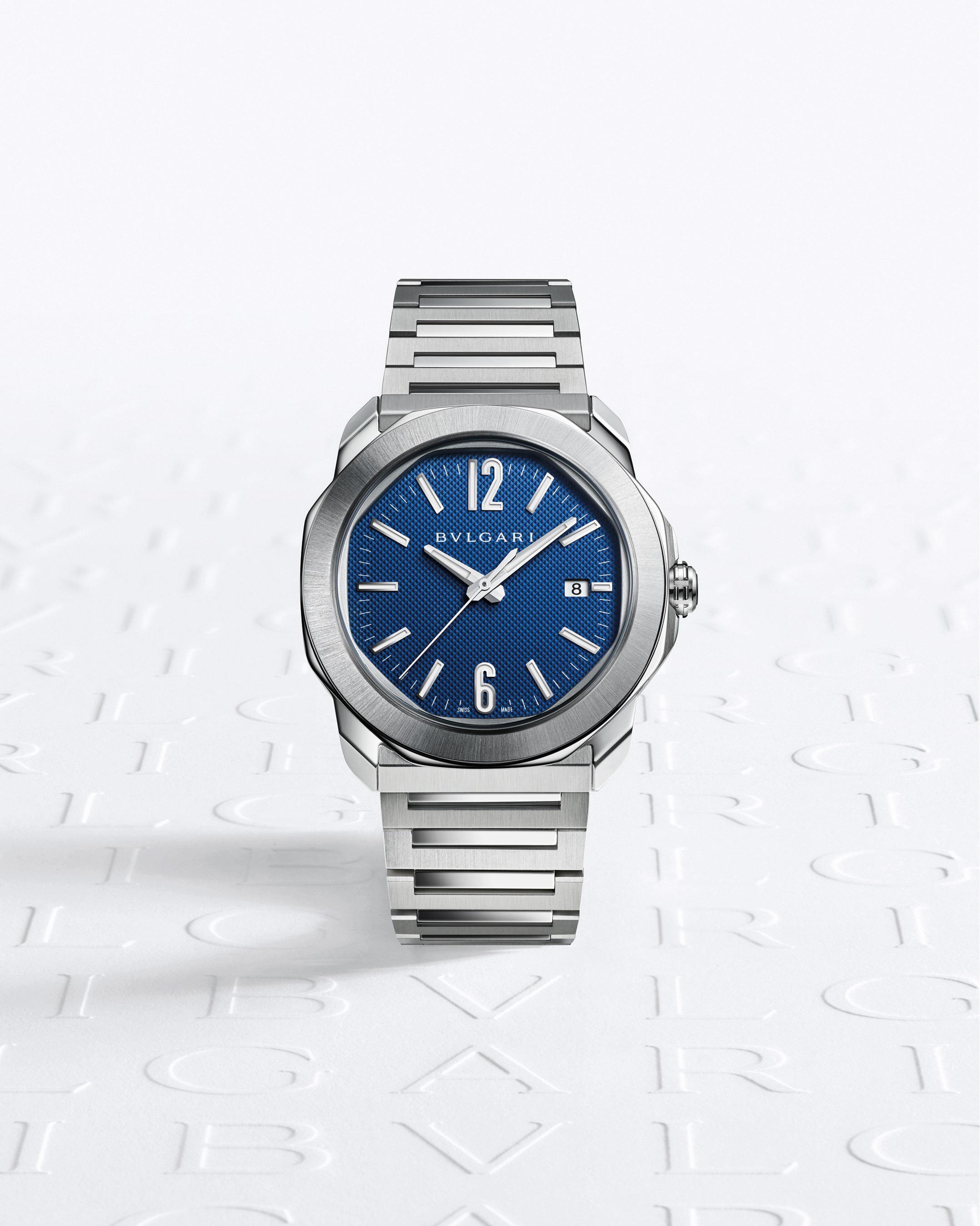 時・分・秒の3本の針と日付表示、自社製キャリバーBVL191を搭載した径41㎜の自動巻き機械式「オクト ローマ オートマティック」のもうひとつの特長が約42時間のパワーリザーブです。視認性の高さを誇るダイヤルには美しいクルドパリモチーフが施され洗練された雰囲気を放っています。伝統的なスイスのオートオルロジュリーのモチーフである細かなピラミッドが連なる模様が、イタリアスタイルのデザインに溶け込みながら光と戯れ、ピースに質感と深みをもたらします。クルドパリの技法で立体感がもたらされたダイヤルはブルー、アンスラサイト、ホワイトの3色のバリエーションで展開され、スタイルや好みで選ぶことができます。ブルーダイヤルはクラシカルでタイムレスな魅力を体現し、ホワイトダイヤルは大胆で意外性のある存在感で人々を惹きつけます。アンスラサイトダイヤルは、洗練された上品さを好まれる方に最適なモデルです。視認性を重視したダイヤルに配された、針、インデックス、6時と12時位置のアラビア数字にスーパールミノバ®が施されています。
