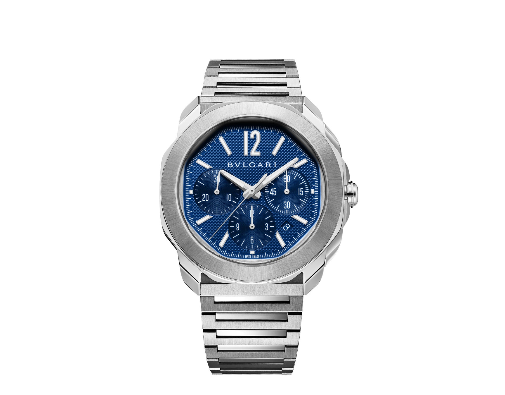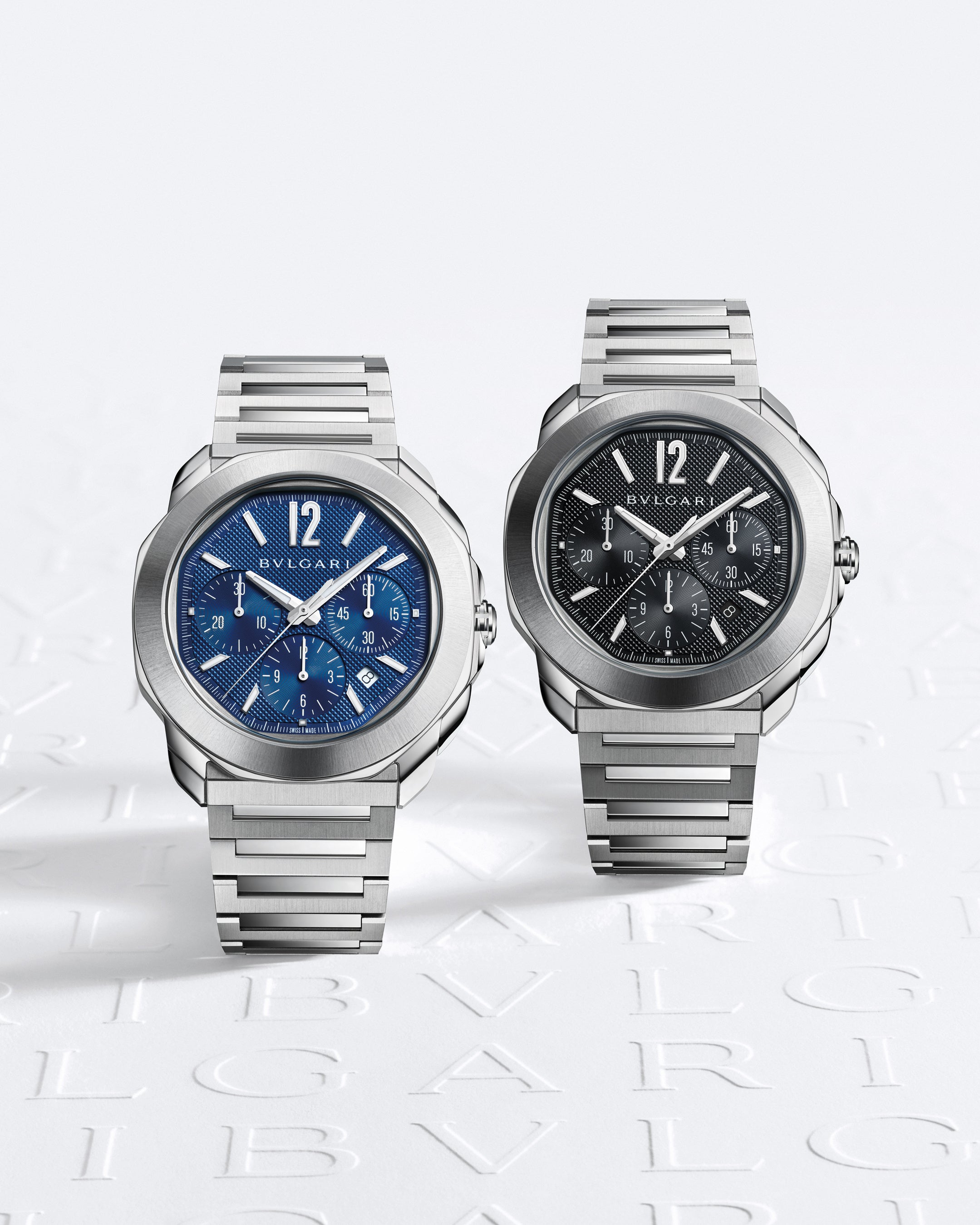 華々しいデビューを遂げた「オクト ローマ クロノグラフ」は、クリアで視認性の高いブルーおよびブラックのディスプレイと洗練されたダイヤルを特徴としています。センターセコンド、30分積算計、12時間積算計を備えたクロノグラフ機能により極めて高い精度で時間経過を把握できます。日付表示は4時位置と5時位置の間に配され