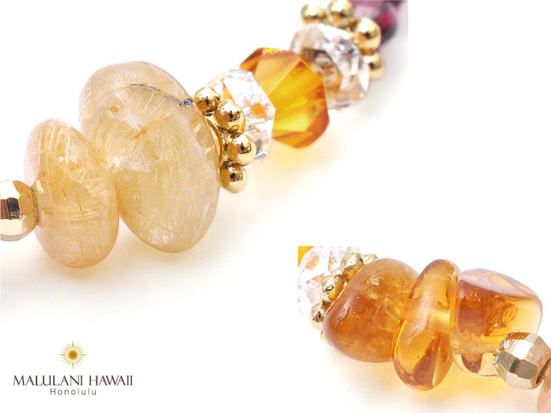 何万年もの太陽のエネルギーを宿すと伝えられるアンバーをはじめ、繁栄をもたらすシトリン、金色の針が必要な縁やチャンスを運ぶゴールデンルチルなど、豊かなエネルギー満載の石を贅沢に配置。