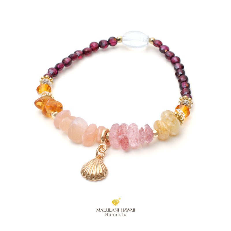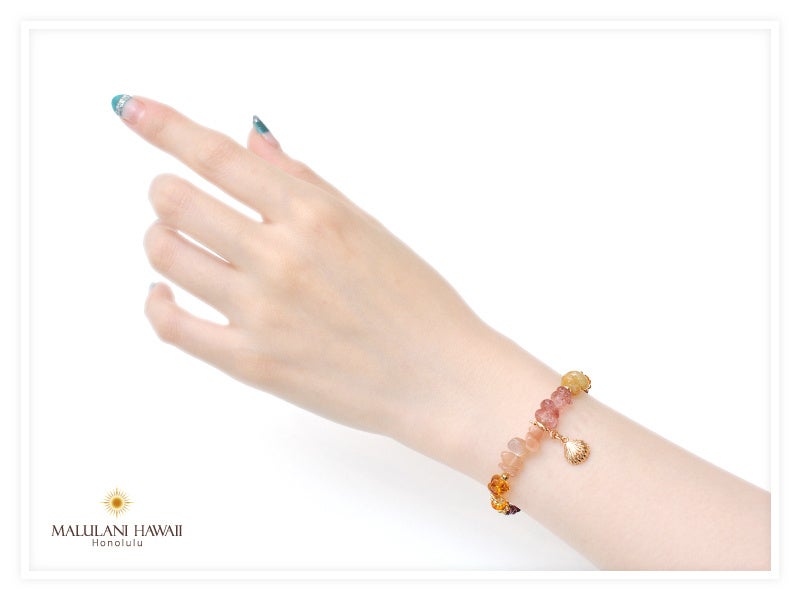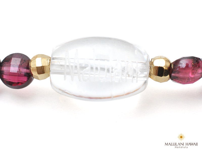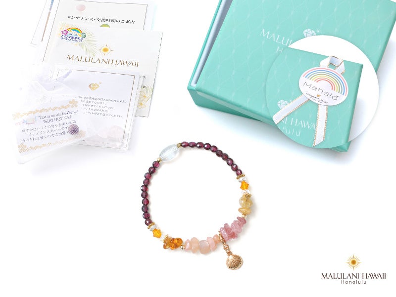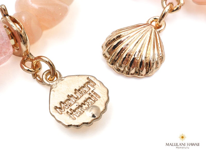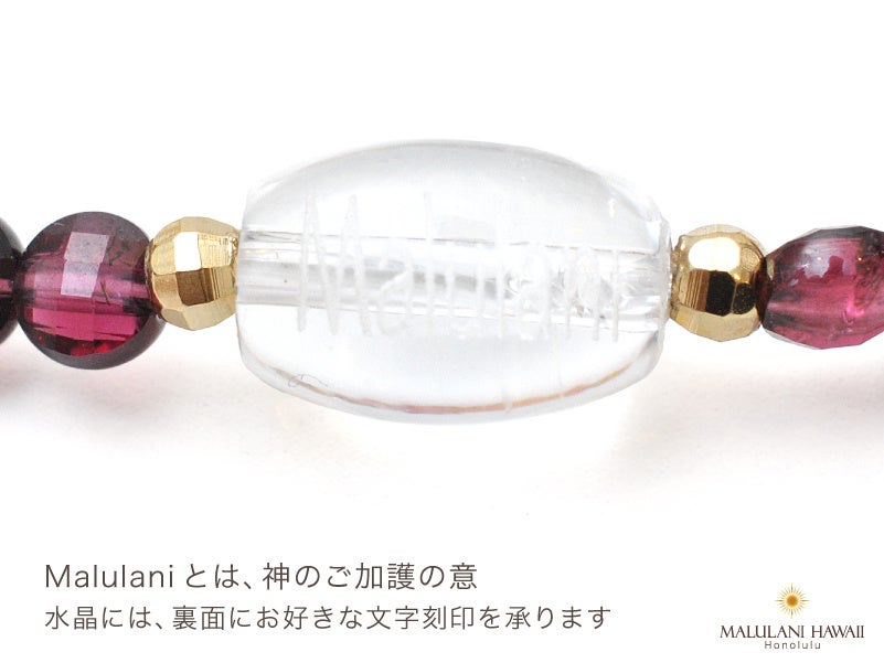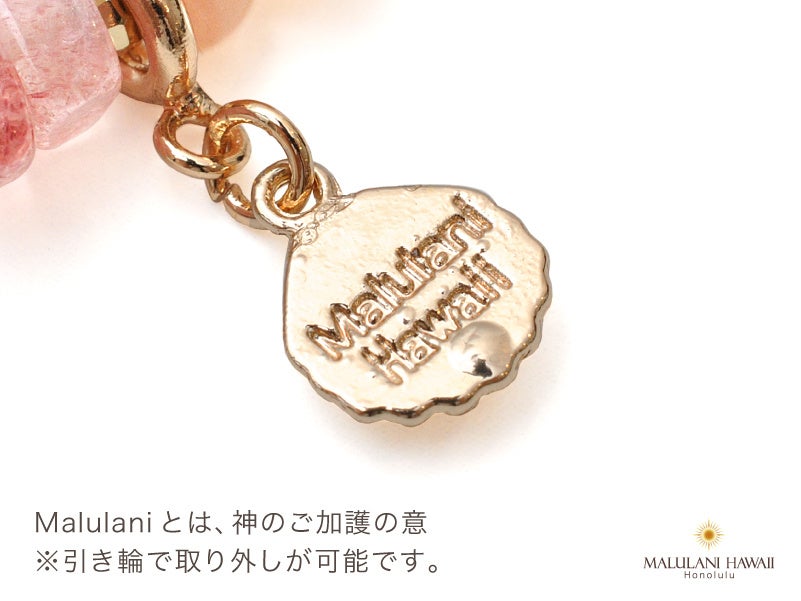 水晶とオリジナルチャームには、ハワイ語で「神に護られた」を意味する「Malulani」と刻印。