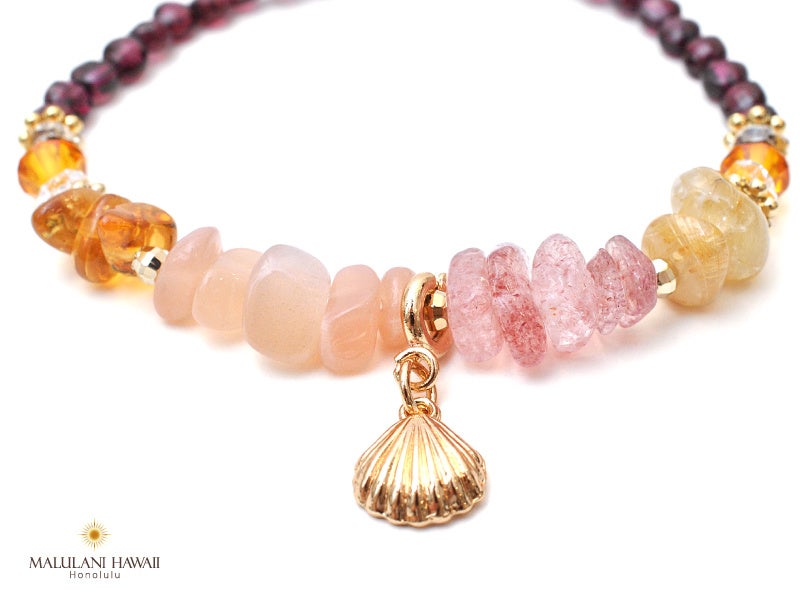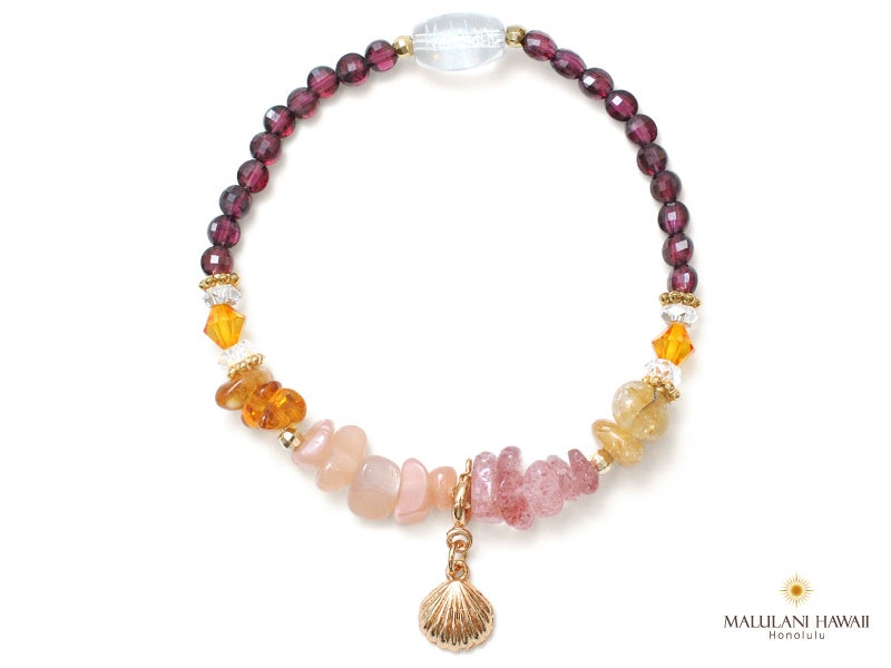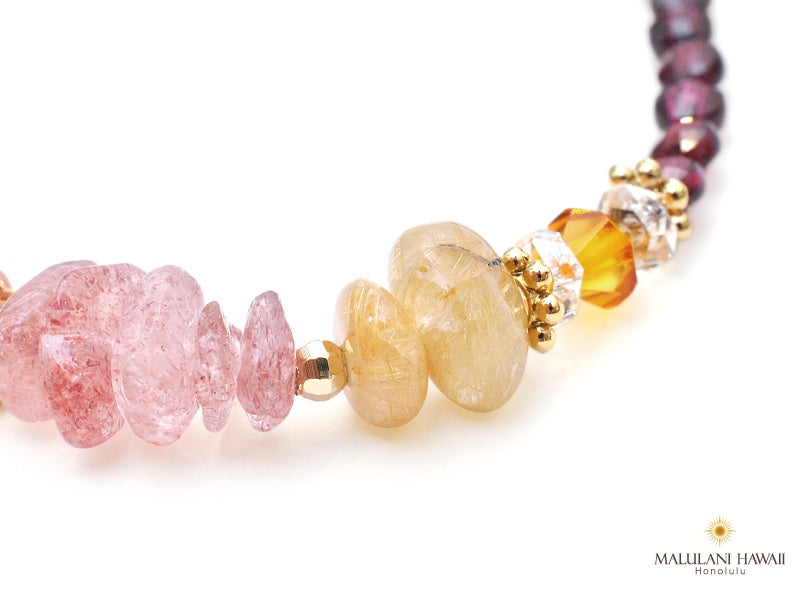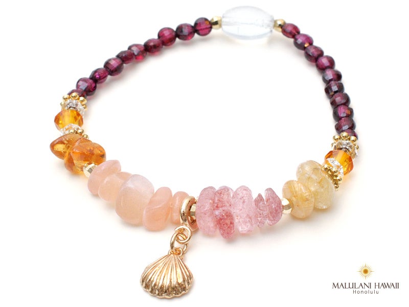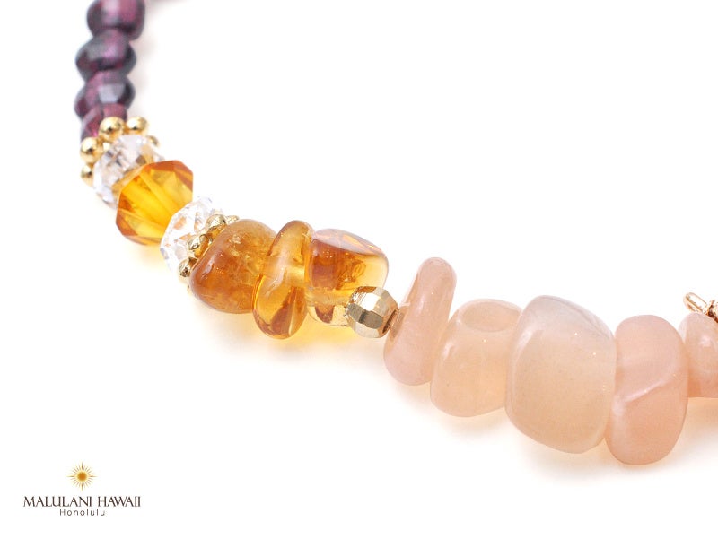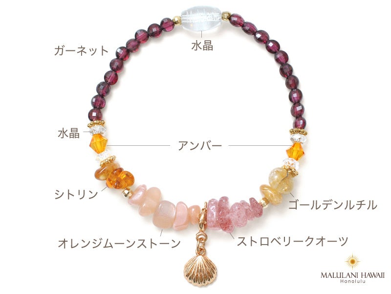 女性性をサポートするオレンジムーンストーン、無償の愛を教えるストロベリークオーツを添え、大きな愛に守られ、大切な絆を育てていくことをサポートしてくれるよう仕立てました。