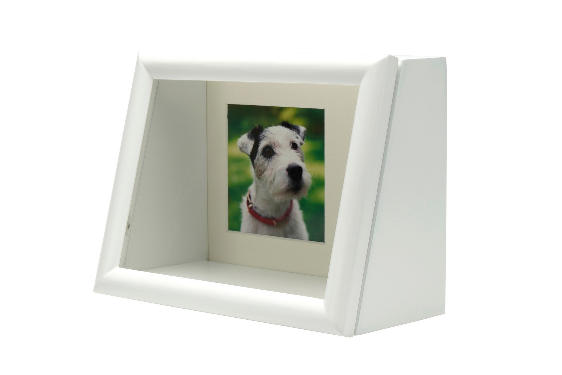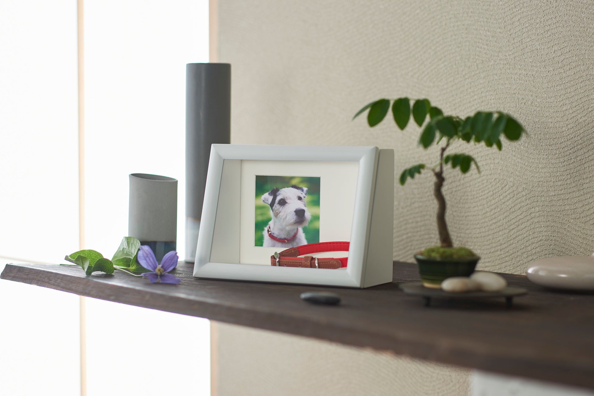 犬、猫、鳥、ウサギ、ハムスターなどのペットの想い出の写真と、愛用していた首輪やお気に入りのオモチャなど、想い出のお品を一緒に飾ることができます。インテリアになじむシンプルなデザインで、飾る場所を選びません。