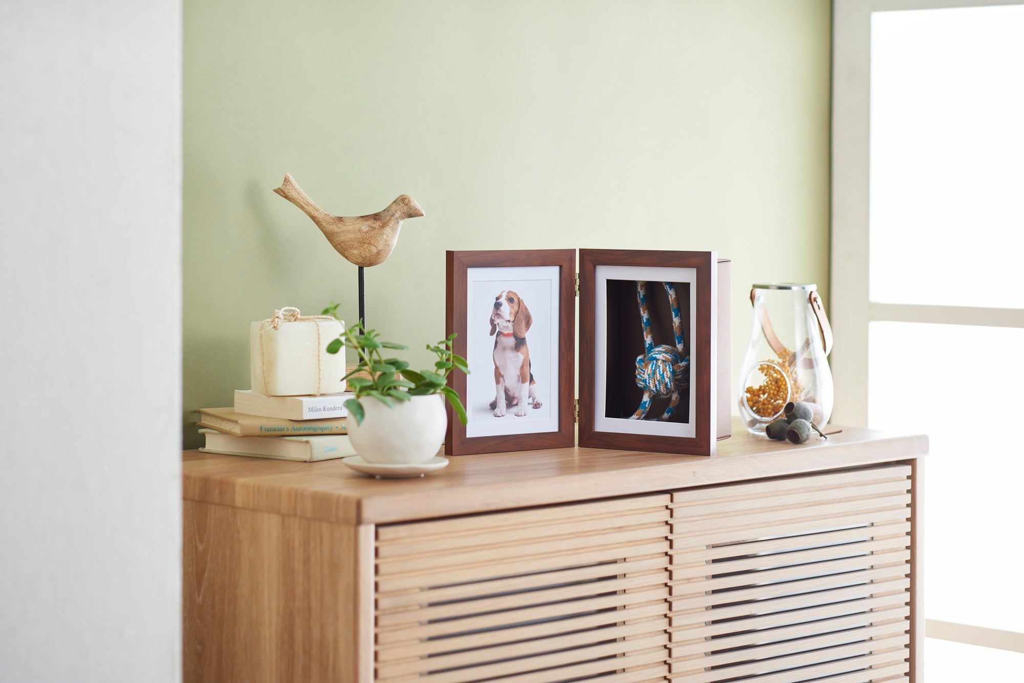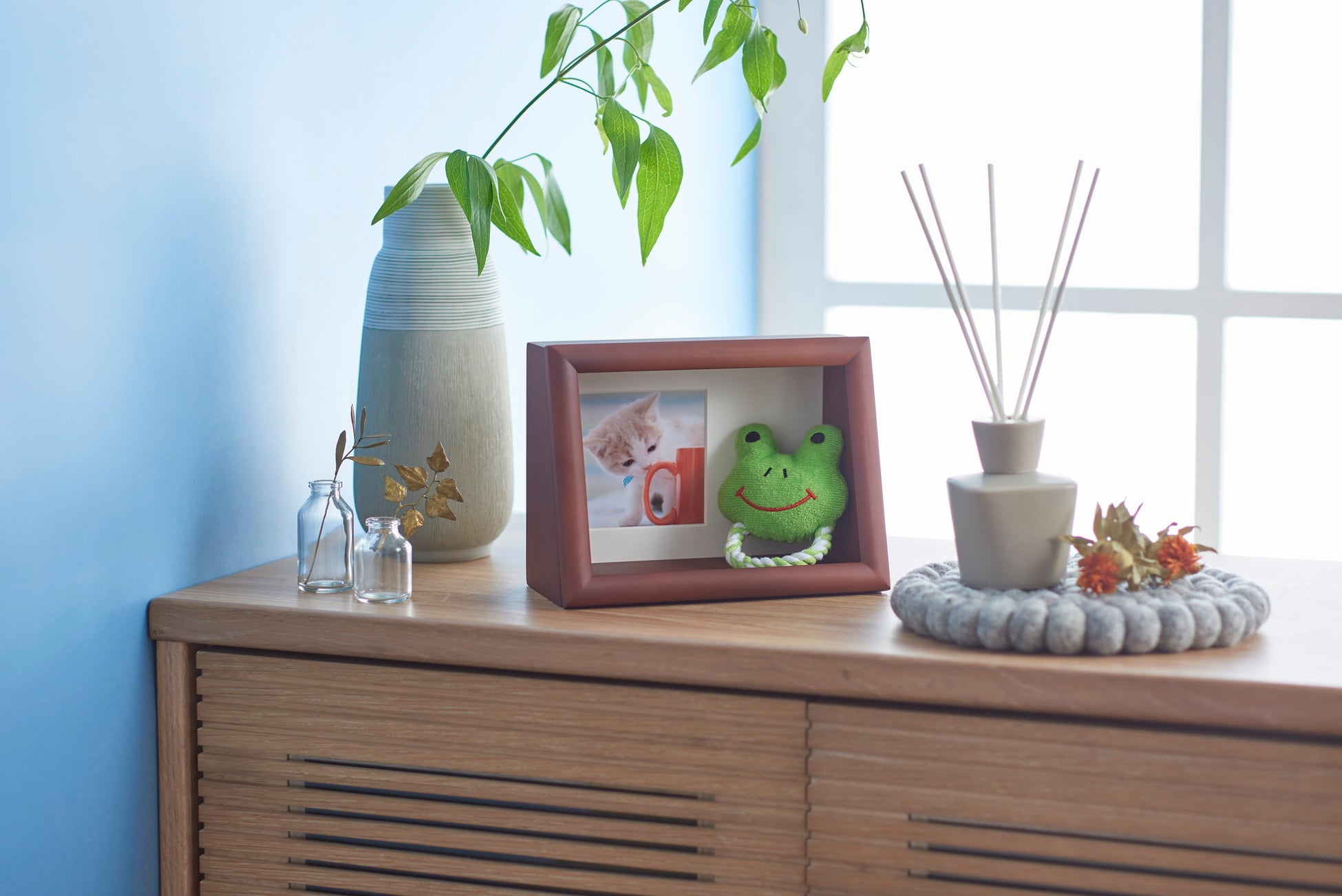 ペットの写真と想い出のお品を一緒に飾れるフォトボックスフレーム「ディスプレイフレーム」「ディスプレイBOX」、ナチュラルな質感がおしゃれな2面タイプフォトフレーム「レクエル Duo」