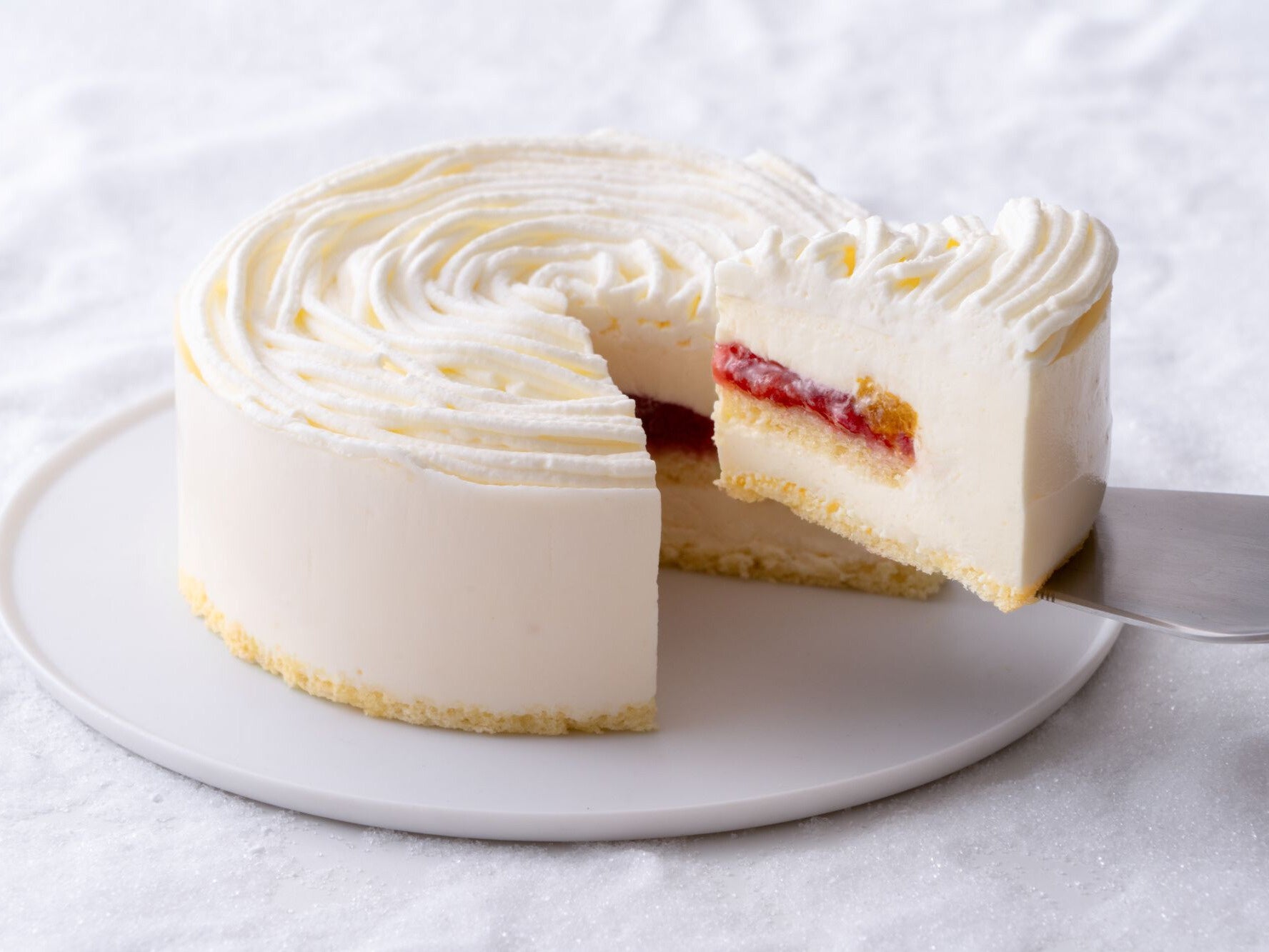 マスカルポーネを使用したミルクムースと、爽やかなクリームチーズのクリームを、降り積もる雪のようにふんわりと絞り、ミルキーなコクとリッチな口どけに。中に忍ばせた色鮮やかな苺とフランボワーズのソース、みかんの甘酸っぱい果肉が絶妙にとけあって口の中いっぱいに広がります。