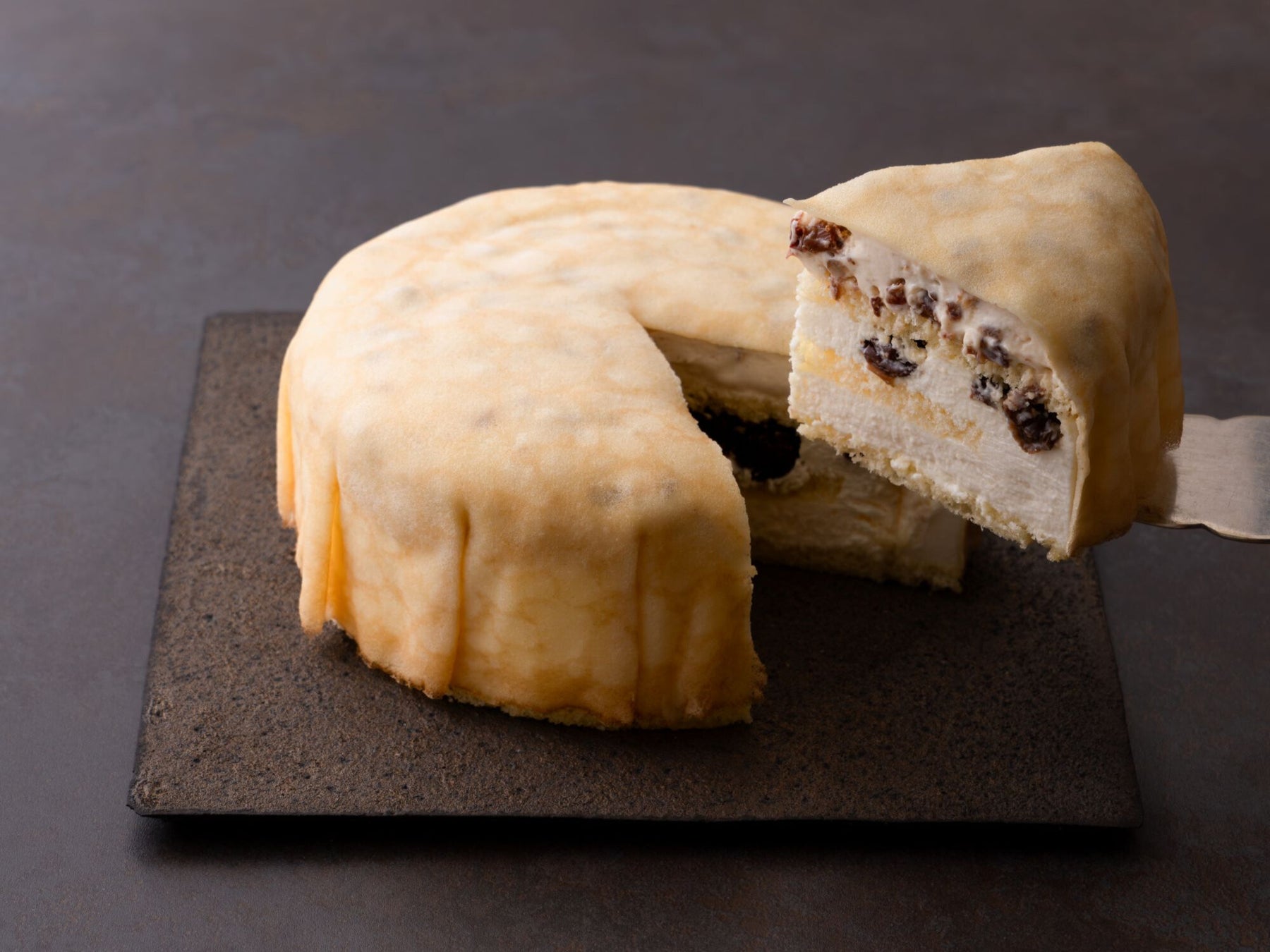 芳醇な2種のラムレーズンで、奥行ある豊かな香りを引き出した大人のケーキに仕立てました。爽やかなチーズムース、ピーカンナッツの食感がアクセントになったコクのあるカスタードクリーム、2種のラムレーズンが織りなす絶妙なハーモニー。なめらかなクレープ生地が全体をやさしく包み込み、おいしさのサプライズを演出しています。