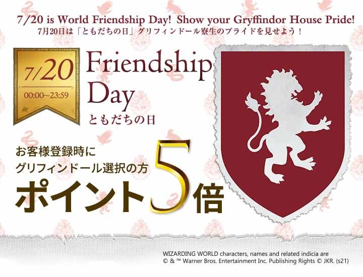 2022年7月20日(水)の「ともだちの日」にちなみ、決断力と勇気があり、勇敢さを合わせ持つ者が集うとされる“グリフィンドール”の寮に所属する、グリフィンドール寮生のお客さまは当日のお買い上げに限りポイントが5倍になります。スリザリン寮生、レイブンクロー寮生、ハッフルパフ寮生のお客さまは次の機会を楽しみにお待ちください。