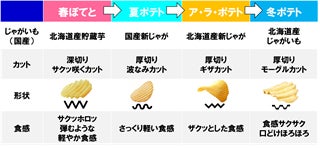 当社では、“四季を巡るポテトシリーズ”として、「春ぽてと」、「夏ポテト」、「ア・ラ・ポテト(秋)」、「冬ポテト」を季節限定で発売しています。ザクッとした食感を生み出す「ア・ラ・ポテト」の厚切りギザカットなど、季節を感じられるようにポテトチップスの形状や味わいを工夫しています。