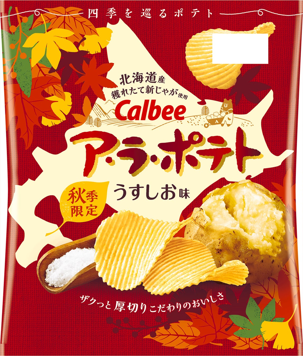 ●パッケージは、北海道の地図イラストを背景に「ア・ラ・ポテト」ロゴを大きく配置。「北海道産穫れたて新じゃが使用」の文字を目立つように配し、紅葉のイラストで秋らしさを演出。売り場でも季節を感じられるように工夫しました。