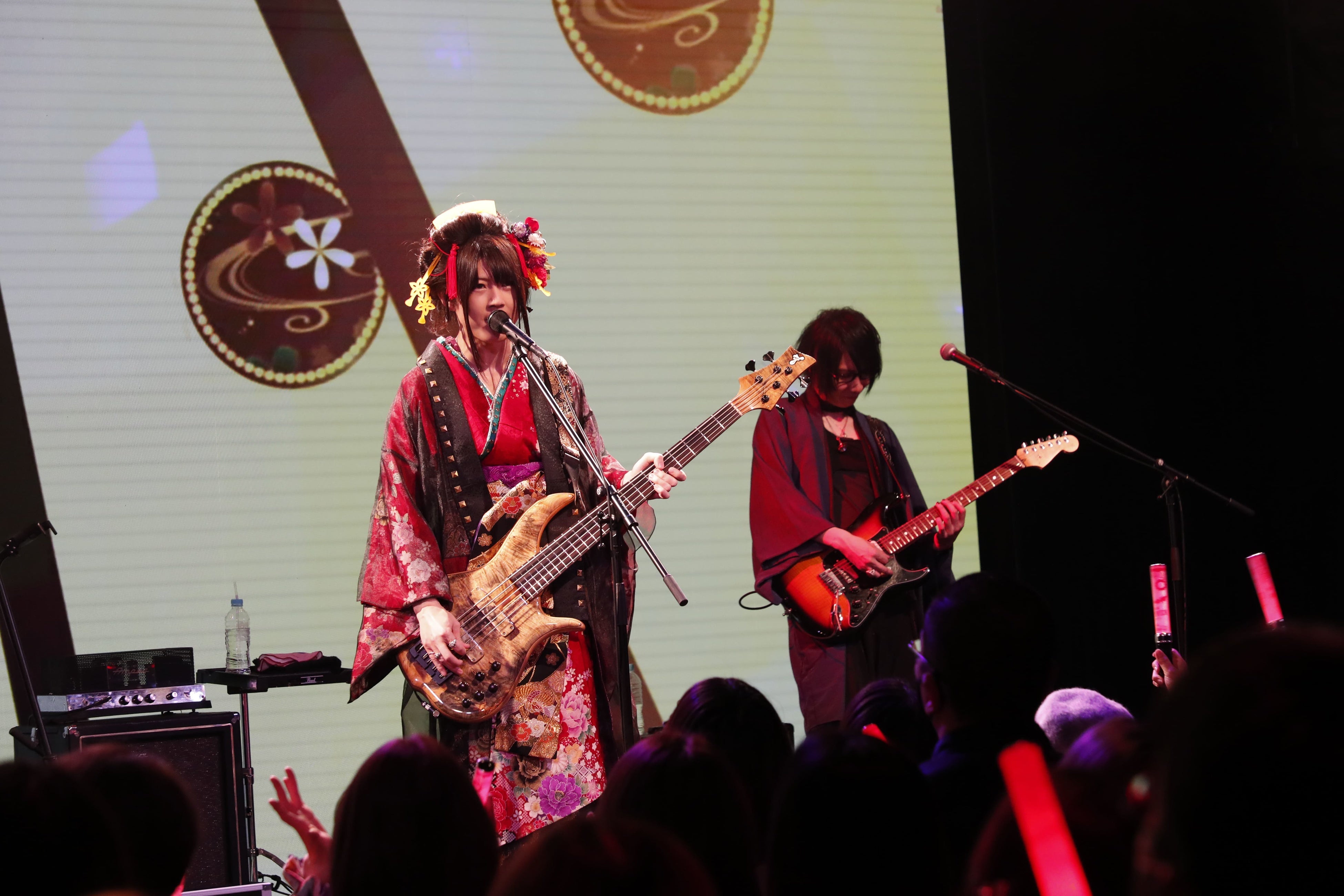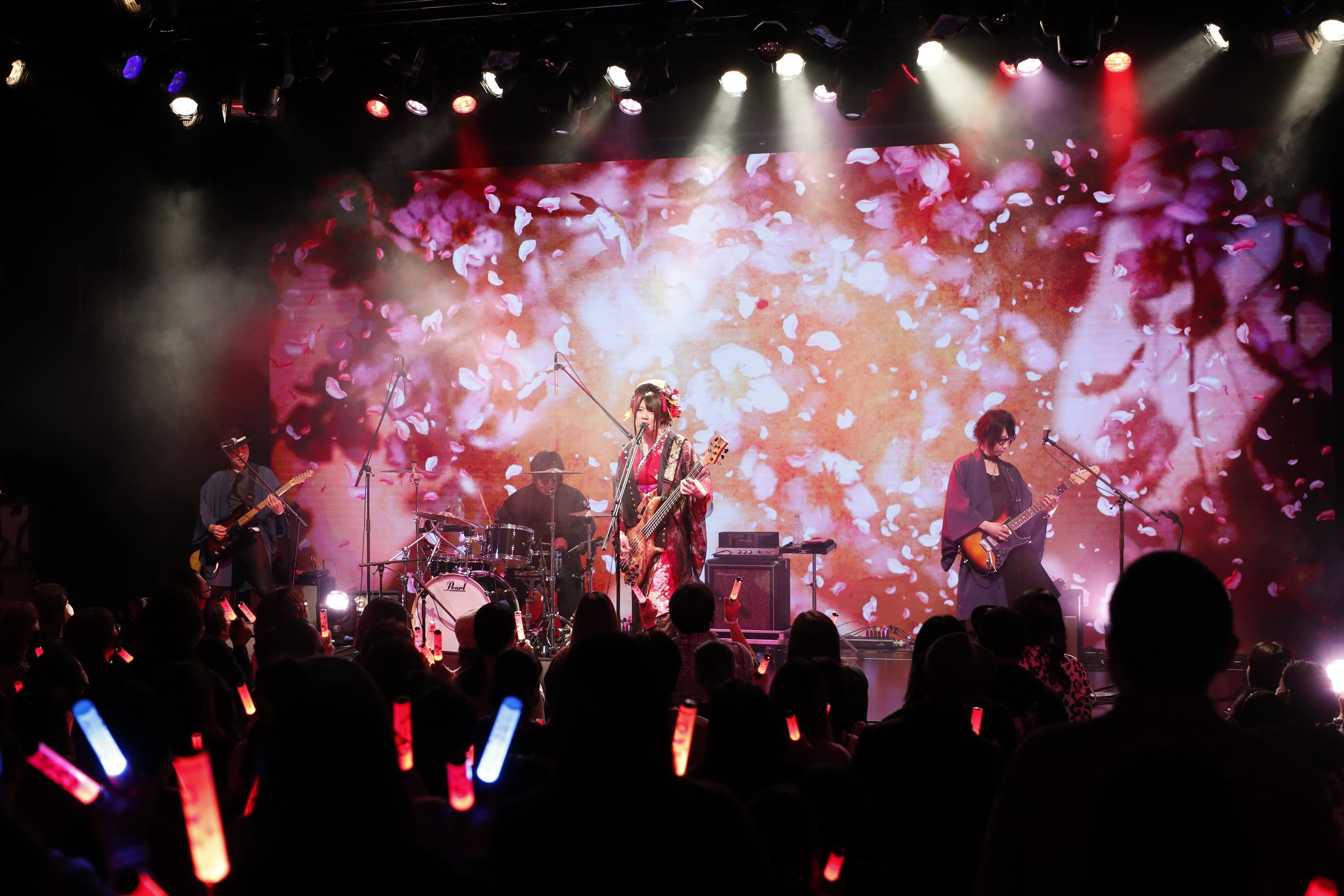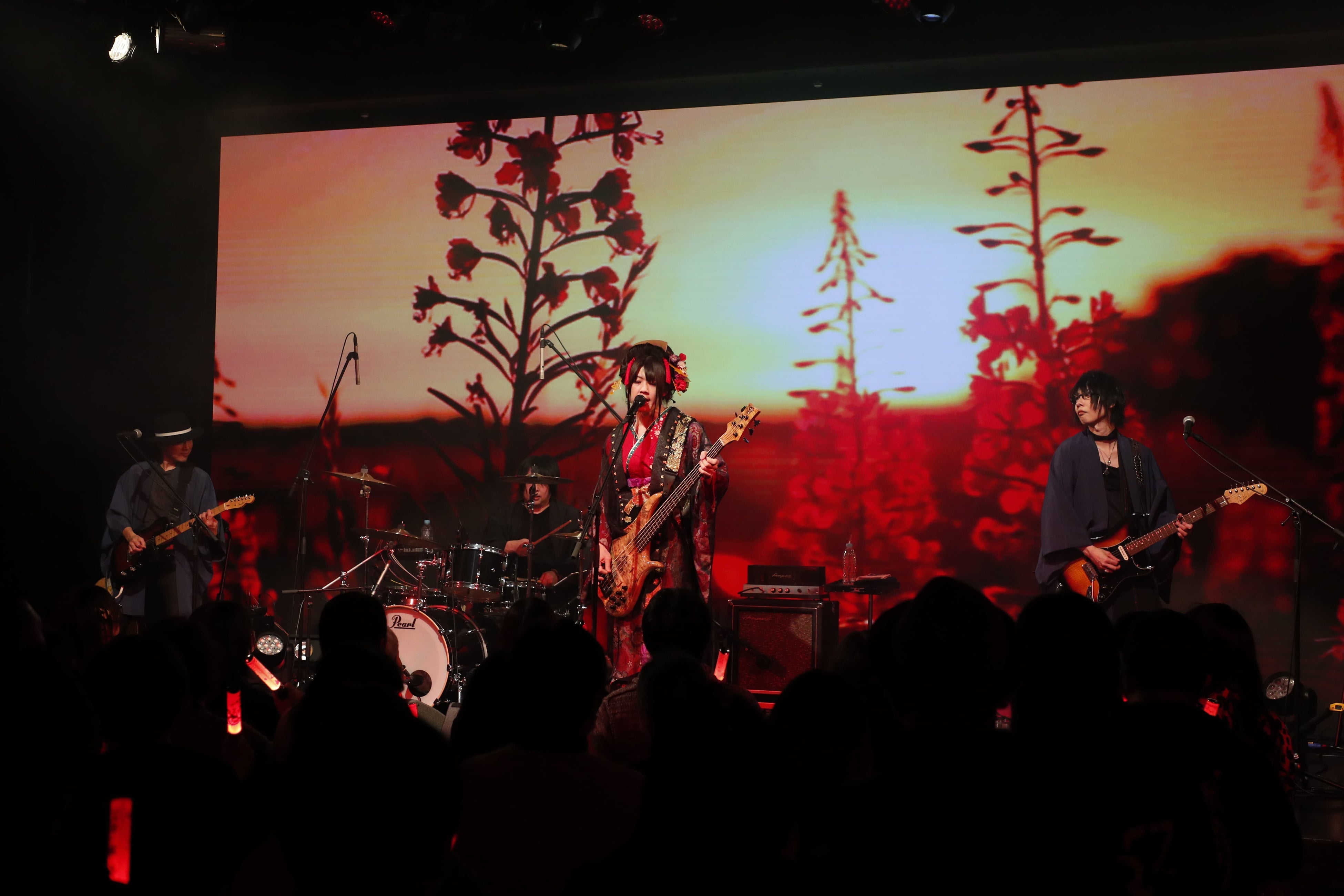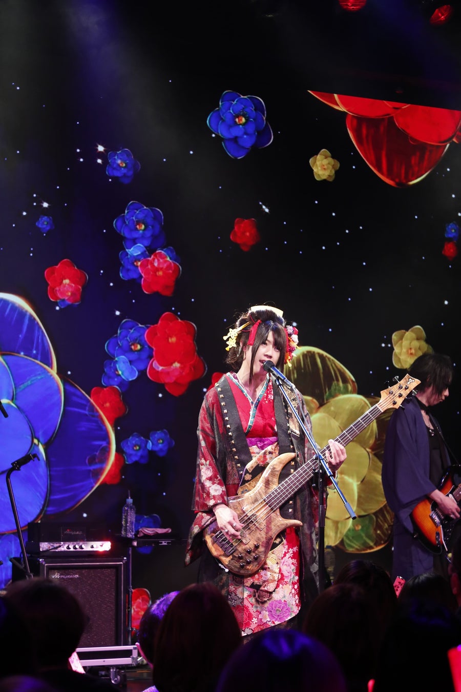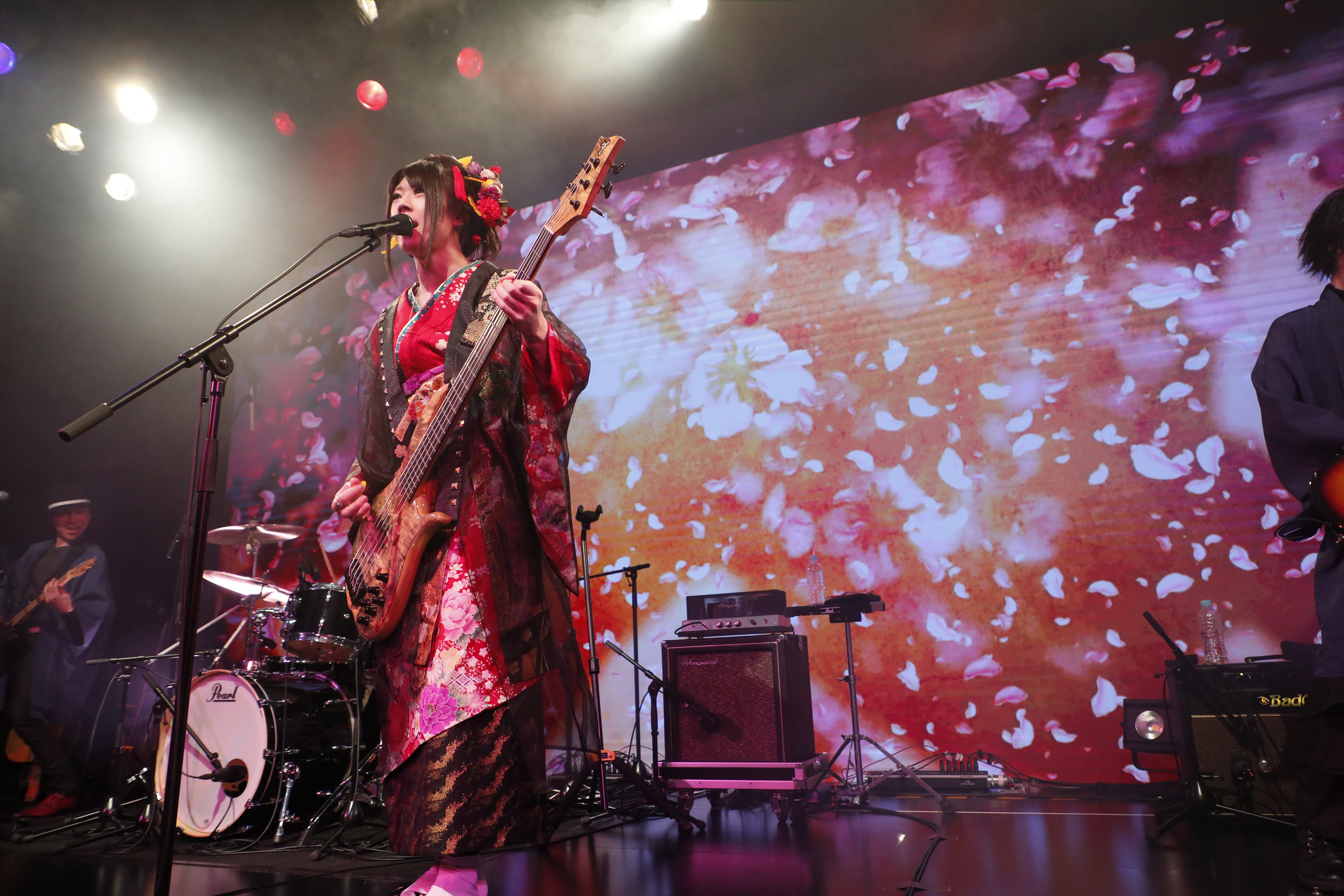 アルバム『令和イデオロギー』のジャケット写真さながらに、艶やかな緋色をした着物に、黒の薄い紗布で織られた打ち掛けを羽織り、花魁の定番であったという横兵庫の型で髪を結い上げた亜沙が、愛用する楽器を自ら奏でながら歌っていくベースヴォーカル・スタイルもあいまって、そこには不思議な説得力が生まれていたと言っていい。
