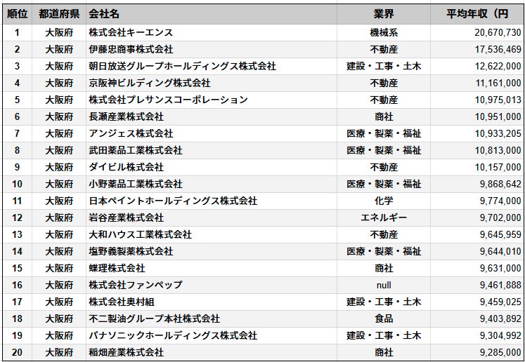 株式会社SalesNow(本社:東京都渋谷区、代表取締役:村岡功規、以下「当社」)は、国内540万社の企業情報を完全網羅した日本最大級のデータベース「SalesNow DB」より、上場企業を対象に大阪府に本社を置く企業の平均年収データを集計・分析し、「平均年収ランキング」として公開いたしました。