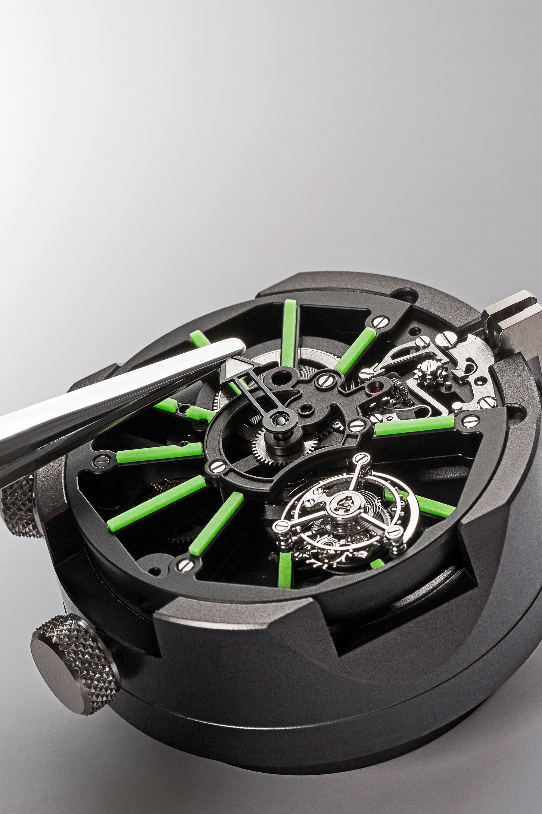 パワフルで高い技術を誇り、同時に遊び心にあふれた雰囲気が魅力的な「オクト ローマ パピヨン トゥールビヨン」。正午になるとウィンドウが時を表示し分表示は0から60までの目盛りが記された半円状で示されます。2本の針が交互に時を指し示し、1本目の針が60分に到達すると夜光性の白いダブルチップが動き時を知らせます。その間、反対の2本目の針は位置で静止し計時はしません。60分が経過すると舞台が転換するかのような切り替わりが行われ、時刻を示していた針が移動し、もう一方の針が垂直の位置に戻ります。特徴的で鮮やかなグリーンカラーを纏った独創的な複雑機構を実現し現代的かつ都会的なデザインのチタン製ケースによって展開されます。