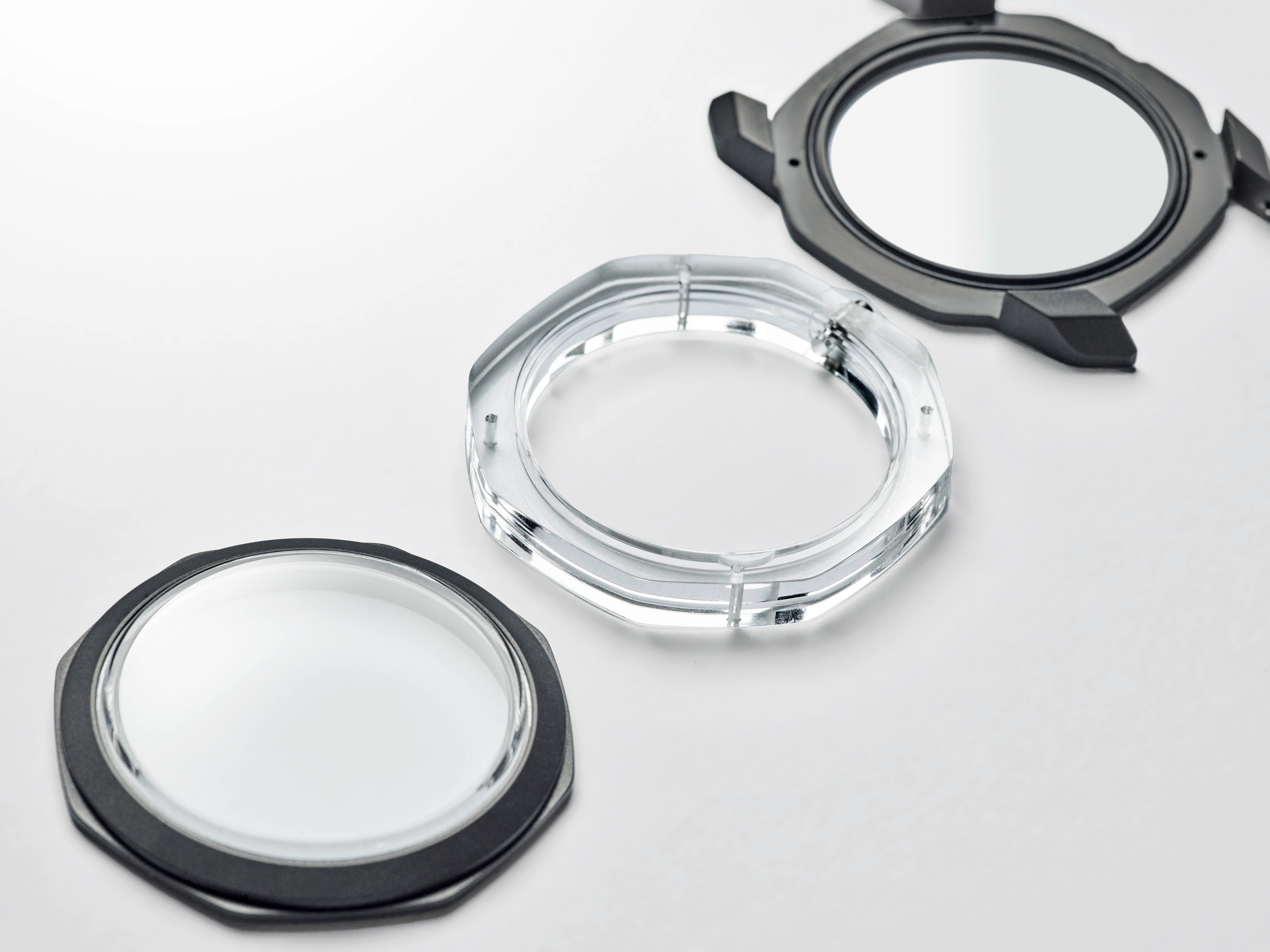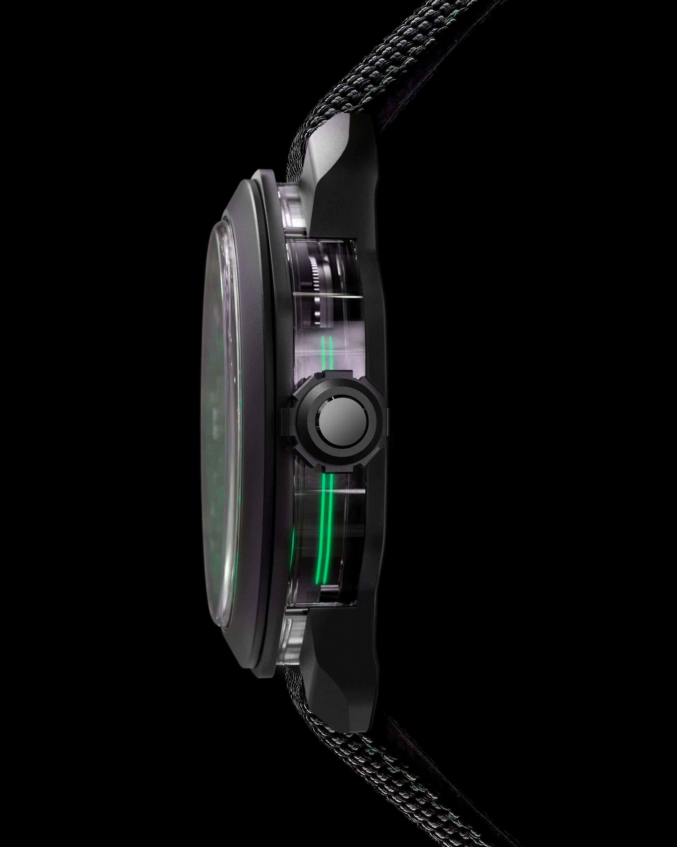 極限にシンプルな形に落とし込み完全にスケルトンの状態になったサファイアのフェイス、バック、ミドルケースから成る光の海に浮かんでいるかのようなムーブメント。長さのあるインデックスはチタン製のケースにしっかりと固定されています。3時位置の意味ありげなプッシュボタンを押すと巻き上げシステムの軸に赤い点が
