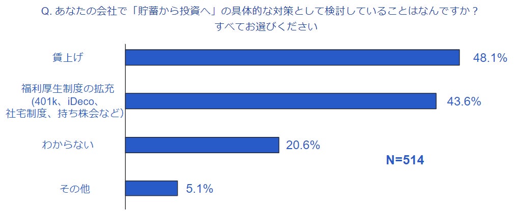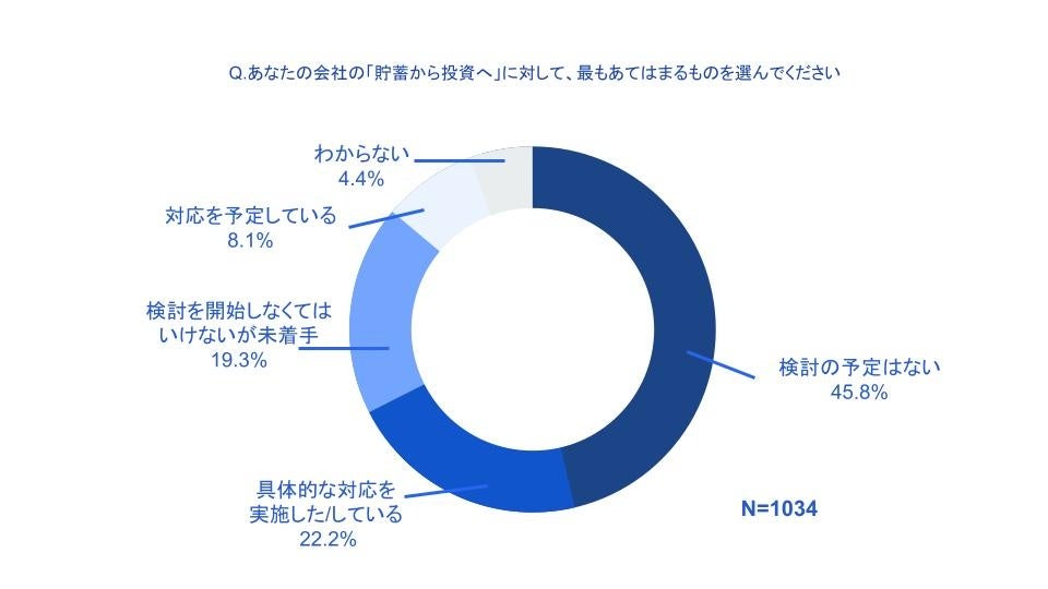 「貯蓄から投資へ」への対応に関して「具体的な対応を実行した/している」が22.2%、「検討の予定がない」が45.8%、「検討を開始しなくてはいけないが未着手」が19.3%、「対応を予定している」が8.1%、「わからない」が4.4%となり、77.6%の企業が対応を実行できていないことがわかりました。