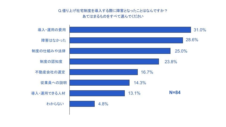 「知っていて導入した」と回答した方に導入する際に障害となったことを問うと、「障害はなかった」が28.6%、「導入・運用の費用」が31.0%や「制度の仕組みや法律」が25.0%となり、導入・運用の費用や制度の仕組みや法律が障害となっていることがわかりました。