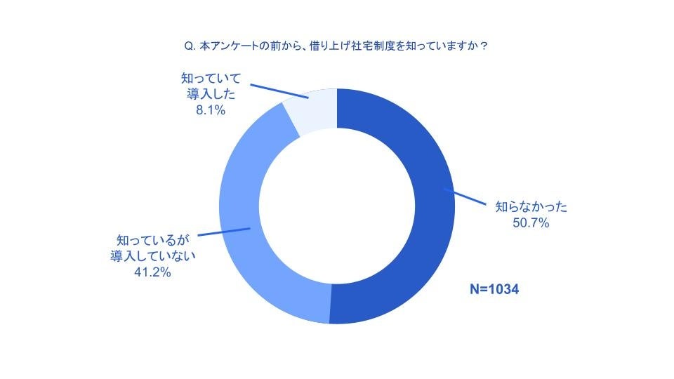 福利厚生の中でも比較的に低コストで中小企業も導入が可能な「借り上げ社宅制度」について認知を問うと「知らなかった」が50.7%、「知っているが導入していない」が41.2%と導入していない企業が90%以上を占め、導入率は8%程度であることがわかりました。