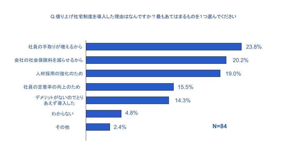 上記の設問で「知っていて導入した」と回答した方に導入した理由を理由を問うと、「社員の手取りが増えるから」が23.8%、「会社の社会保険料を減らせるから」が20.2%と会社と従業員ともにメリットを得られることを理由に導入しており、中小企業が抱えている悩みを借り上げ社宅制度で解決できると考えています。