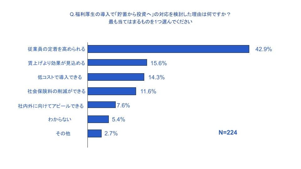 上記の設問で「福利厚生の拡充」で対応を検討していると回答した方へ理由を問うと、「従業員の定着率を高められる」が42.9%と大きく占める結果となりました。
