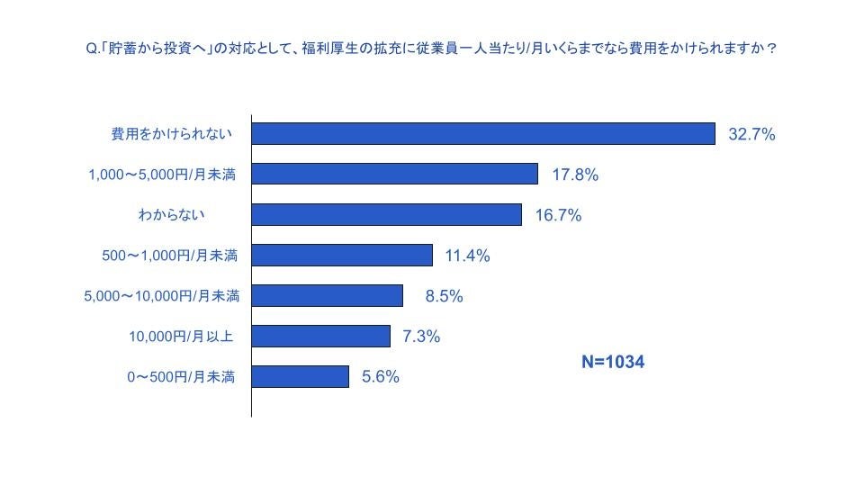 福利厚生の拡充に対するかけられる費用について回答を求めたところ、「費用をかけられない」が32.7%、「1,000~5,000円/月未満」が17.8%、「わからない」が16.7%という結果となり、中小企業は福利厚生の拡充による十分な予算を確保できないことがわかりました。
