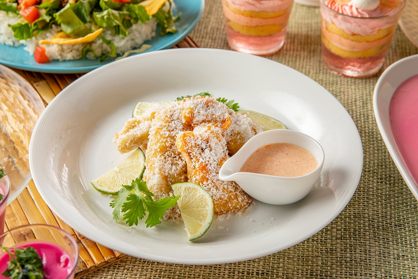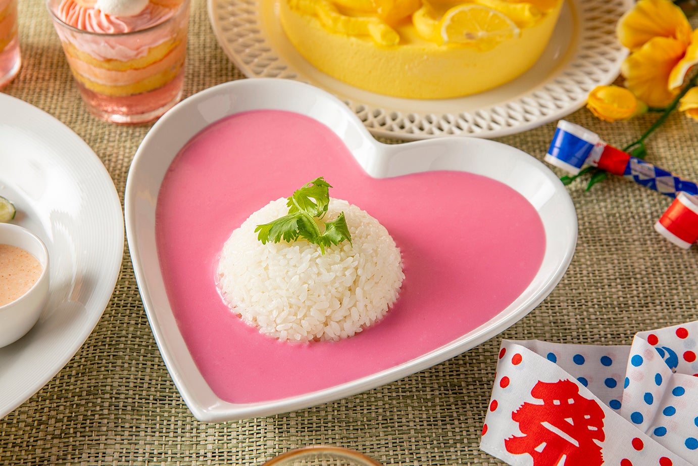 夏祭りをイメージした装飾の店内では、ココナッツフレークをまぶしカラッと揚げたハワイの定番食材マヒマヒに、スパイスと酸味の効いたヨーグルトソースをかけた「ココナッツ香るマヒマヒフリット」や、栄養価の高いビーツを使用し、見た目と味のギャップが楽しい「スパイシーピンクカレー」、夏のBBQを彷彿とさせるようなダイナミックな「シュラスコ」、沖縄の人気料理「タコライス」など暑い地域のご当地メニューや夏に食べたいスタミナグルメを多数ご用意いたします。