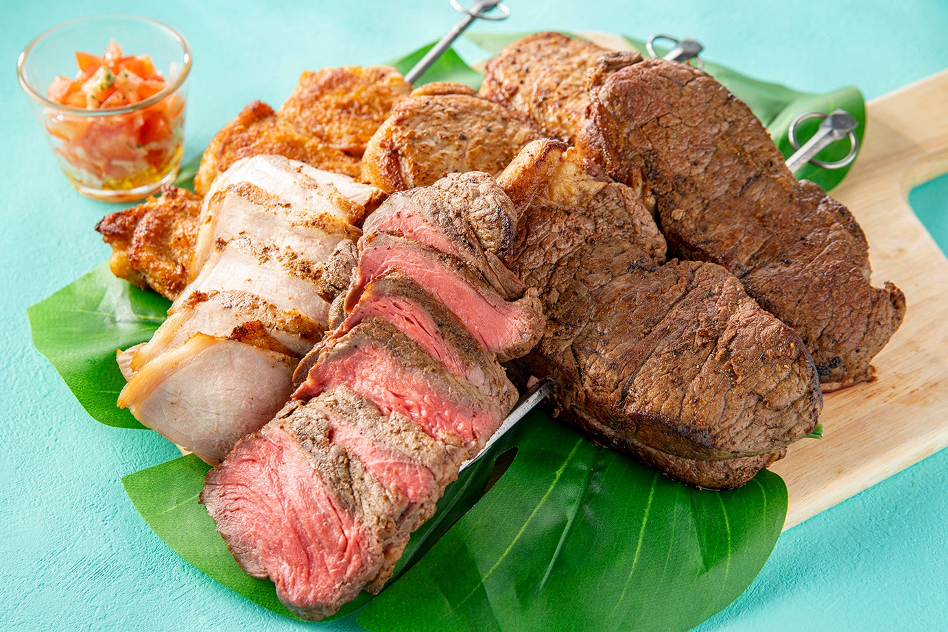 (写真左)ココナッツ香るマヒマヒフリット (写真中央)スパイシーピンクカレー (写真右)シュラスコ(牛・豚・鶏)