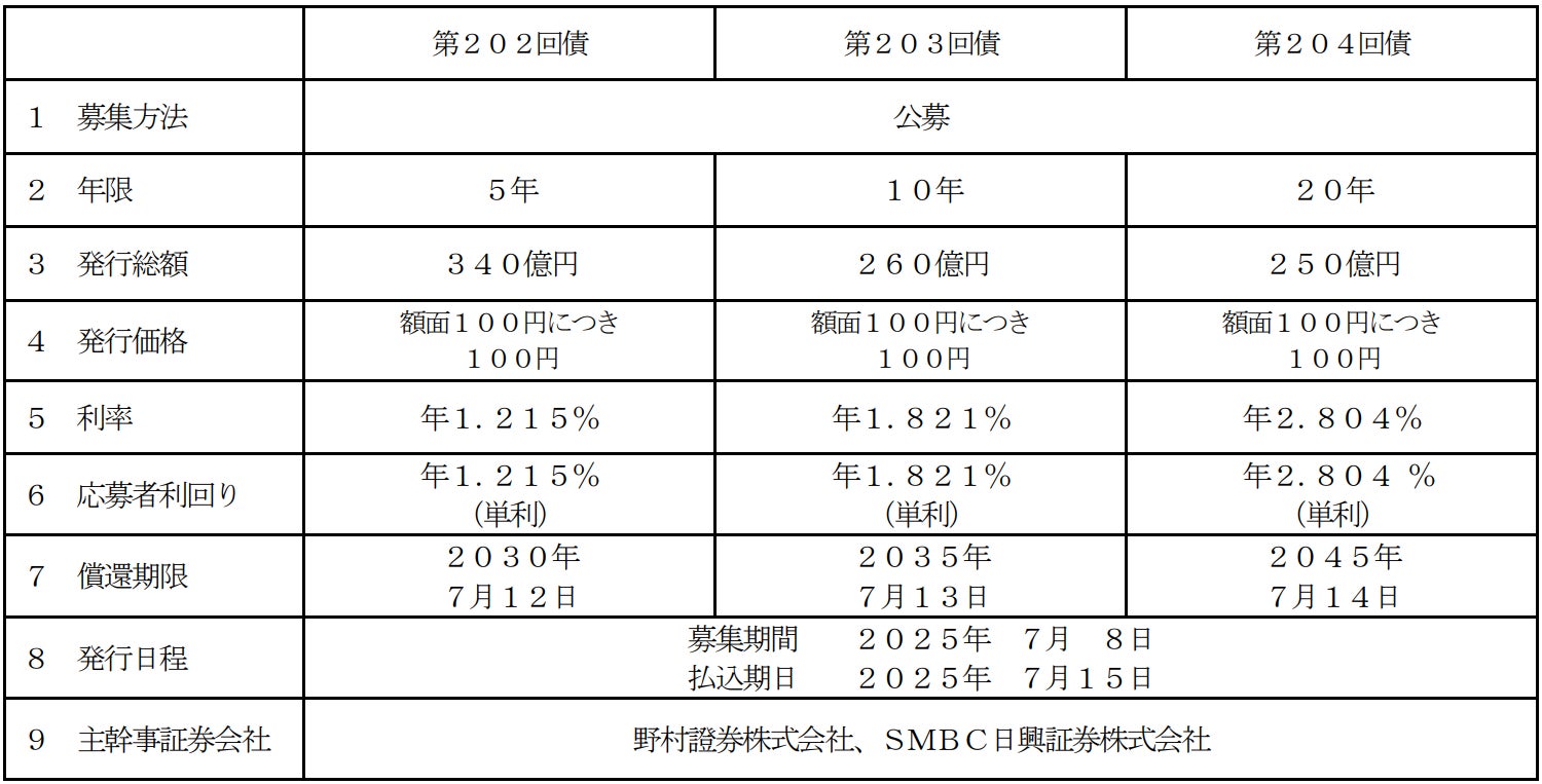 ・発行総額は5年債が340億円、10年債が260億円、20年債が250億円、合計850億円です。