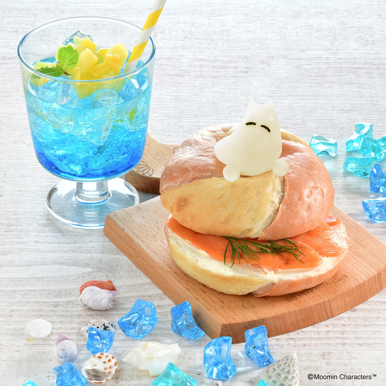 うきわに見立てビーツで色付けした赤と白の縞模様のベーグルに、ゆで卵で表現したムーミンがのった夏らしいベーグルサンドです。スモークサーモン、クリームチーズ、北欧定番のハーブ“ディル”とタルタルソースをたっぷりサンドしました。セットにはブルーラズベリーソーダの上に角切りパイナップルを乗せたソーダドリンクが付いてきます。