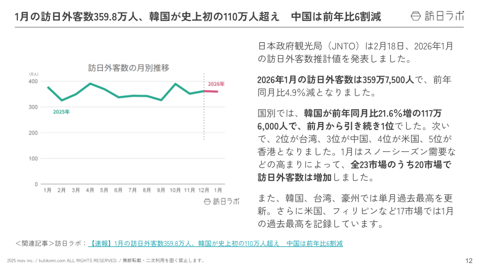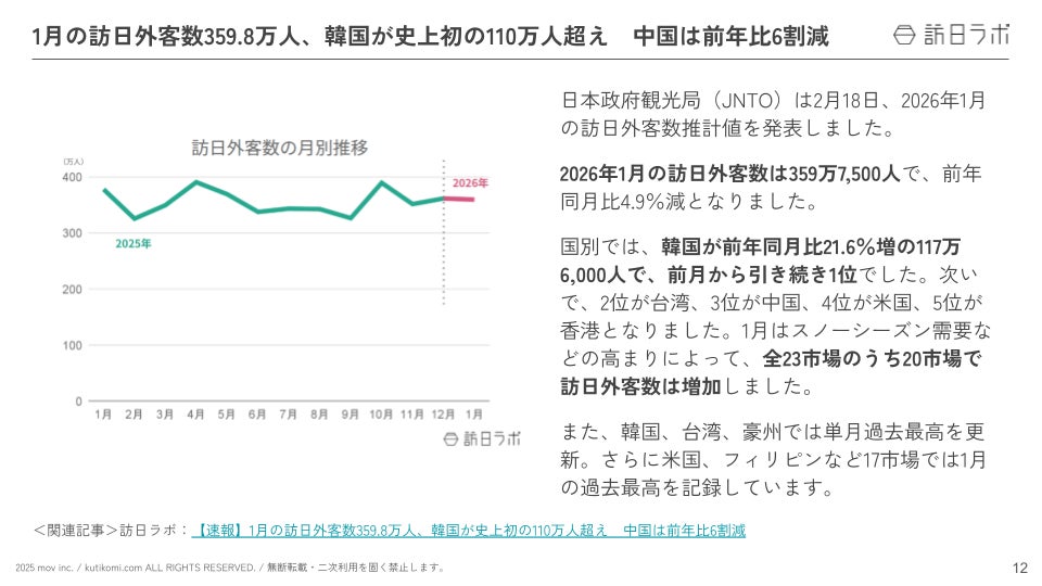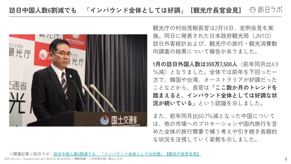 業界最大級のインバウンドビジネスメディア「訪日ラボ」及び 店舗向け集客一元化プラットフォーム「口コミコム」を運営する株式会社mov(代表取締役:渡邊 誠、本社:東京都渋谷区、以下mov)は、「インバウンドに関する最新トレンド・データ」「政府・自治体・企業などのインバウンド関連の取り組み」をはじめ、インバウンド対策に役立つニュースをまとめた「インバウンド情報まとめ【2026年2月後編】」を公開しました。