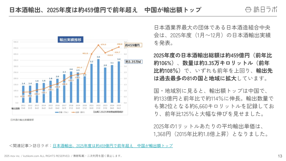日本酒輸出、2025年度は約459億円で前年超え 中国が輸出額トップ