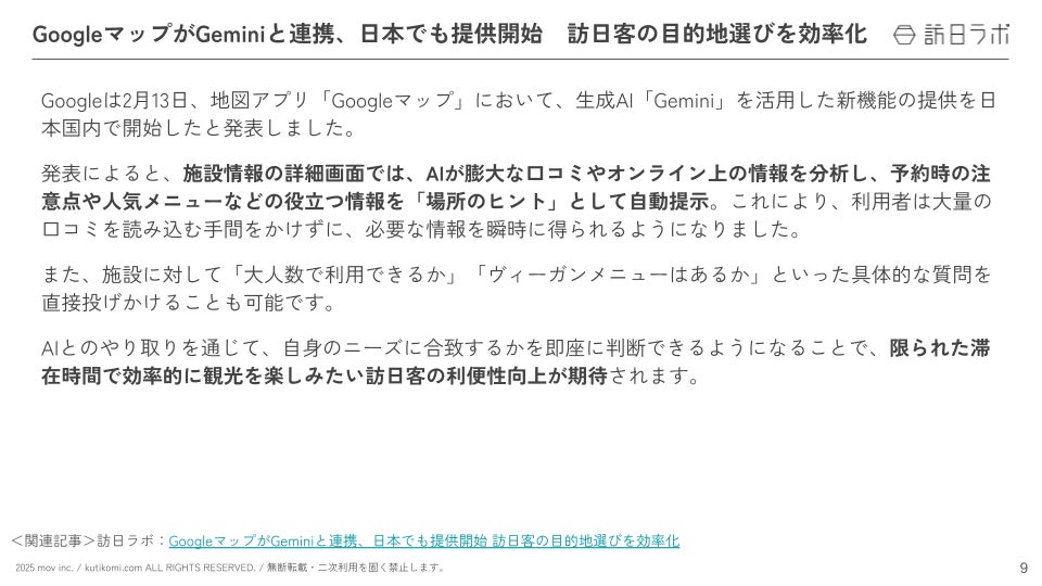 ほかにも「GoogleマップがGeminiと連携、日本でも提供開始」「日本酒輸出、2025年度は約459億円で前年超え 中国が輸出額トップ」など、インバウンド担当者必見の情報をレポートに凝縮!