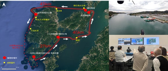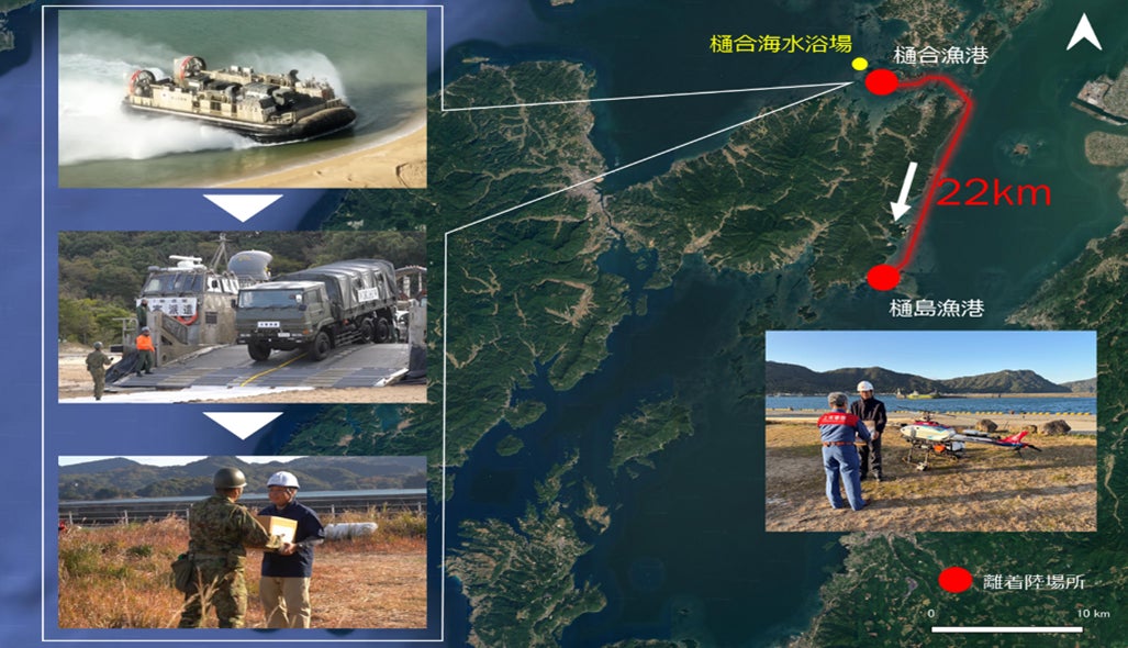 本訓練は、大規模震災により天草地域への陸路が寸断されたという想定で実施され、海・空からの大規模な支援が計画される中、ドローンの偵察飛行によって被災状況をリアルタイムに対策本部へ伝えるとともに、自衛隊が揚陸する救援物資を孤立離島へドローンでリレー輸送しました。